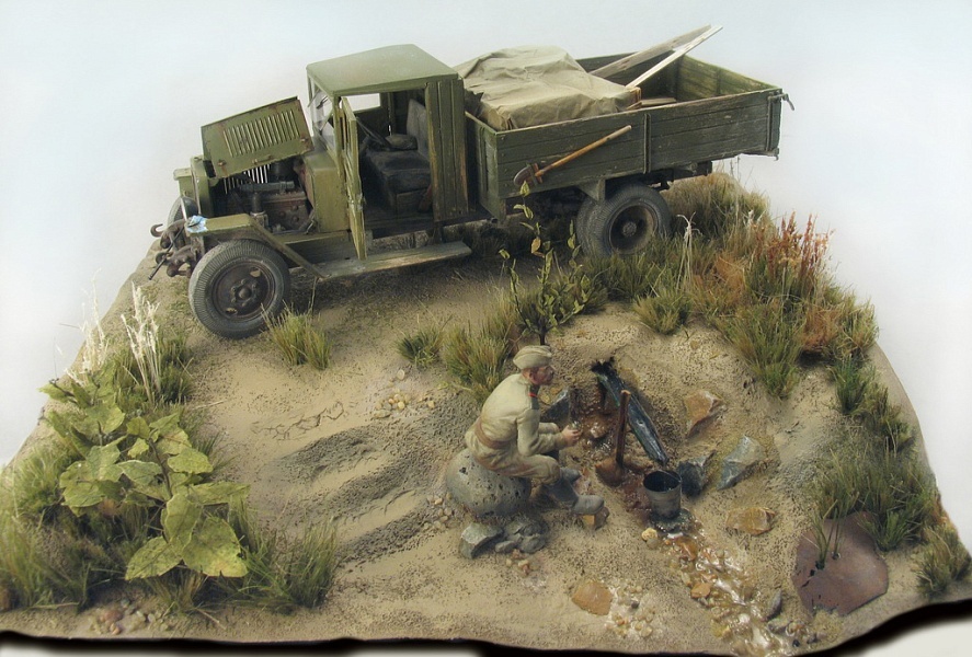 По диораме: конец лета 1943 года, степь, небольшая засуха, водитель съехал с дороги к родничку, за которым посильно ухаживают, набрать воды в радиатор, самому напиться. Водичка течет еле-еле, сел водитель на камень, да призадумался.