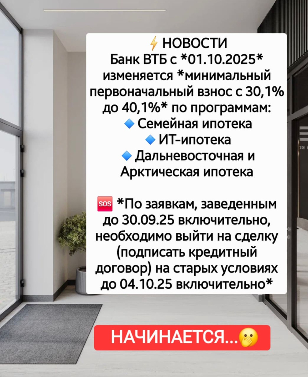С 1 октября ВТБ повышает первоначальный взнос по основным госпрограммам с 30% до 40%. Касается это: · Семейной ипотеки · IT-ипотеки · Дальневосточной и Арктической Важно: Успеть на старых условиях можно только до 4 октября включительно. Что это значит? ВТБ и Сбер задают тренд для всего рынка. Высока вероятность, что другие банки скоро подхватят эту инициативу. На мой взгляд, это может быть связано не только с лимитами, но и с грядущим возможным повышением ставок (ходили слухи о 12% по семейной ипотеке). Банки начинают «притормаживать» выдачу. Есть и исключения, где ПВ остаётся от 20%: · Ипотека от ПФ Банка. · «Комбо»-программы. · Проекты с финансированием от ВТБ. · Ипотека на новых территориях. Итог: Я не нагнетаю, но констатирую факт — время действительно поджимает. Если вы планировали покупку — сейчас последний шанс успеть на более выгодных условиях, даже с учетом повышенного ПВ. Пишите, помогу успеть до дедлайна! @Elena_Yushkova5