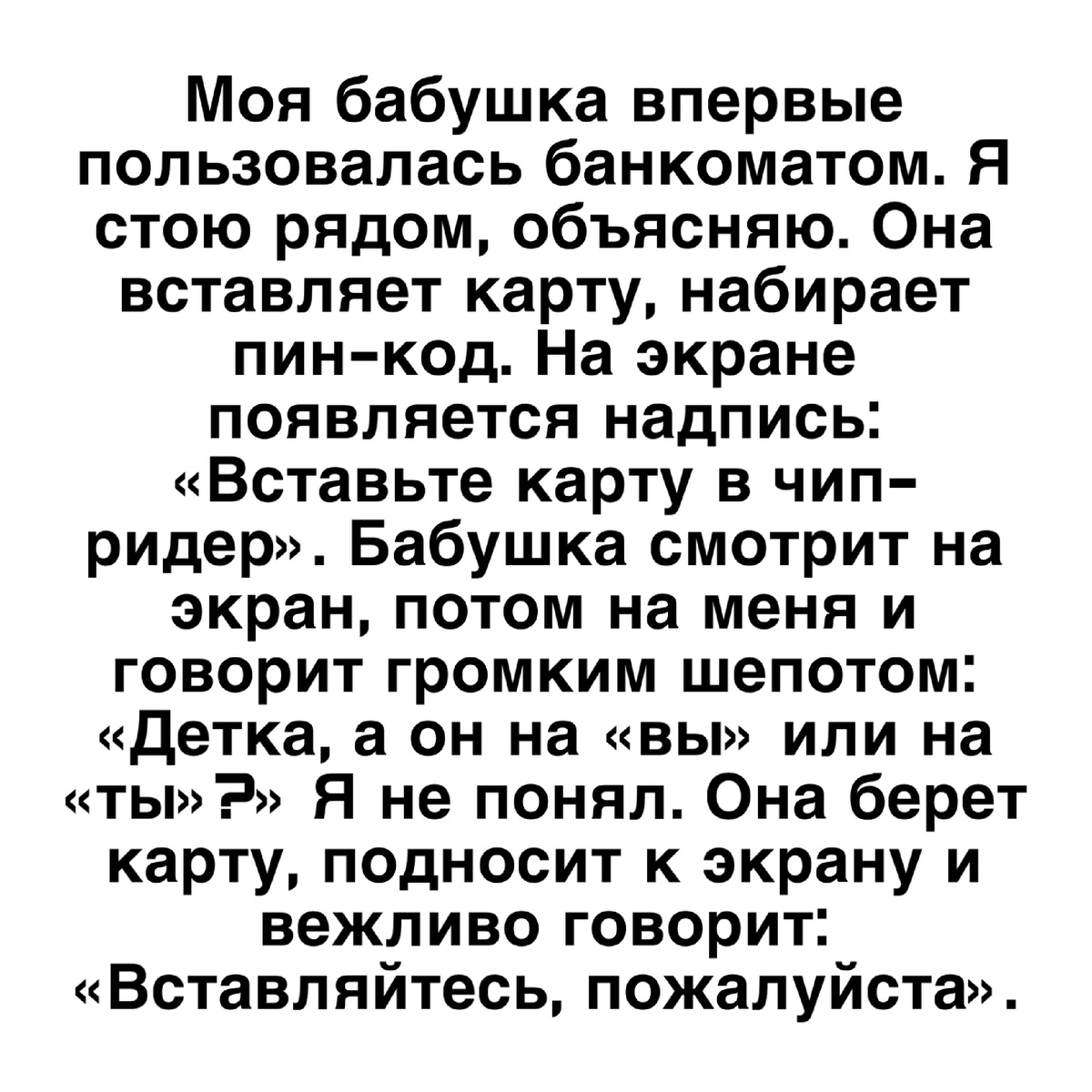 Моя бабушка впервые пользовалась банкоматом. Я стою рядом, объясняю. Она вставляет карту, набирает пин-код. На экране появляется надпись: «Вставьте карту в чип-ридер». Бабушка смотрит на экран, потом на меня и говорит громким шепотом: «Детка, а он на «вы» или на «ты»?» Я не понял. Она берет карту, подносит к экрану и вежливо говорит: «Вставляйтесь, пожалуйста».