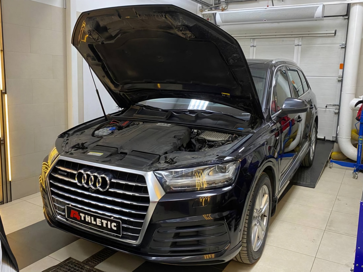 AUDI Q7 3.0 TDI С ОШИБКОЙ ПО САЖЕВОМУ ФИЛЬТРУ (95 тыс. км) ✅ Выполнили: - удаление сажевого фильтра - чистку впуска и отключение EGR - промывку форсунок - чип-тюнинг двигателя До: 249 л.с., 600 Нм После: 310 л.с., 700 Нм 🔧 Удаление сажевого фильтра: - Катализатор сохраняем (не будет резкого запаха выхлопных газов) - Корпус завариваем с помощью аргонодуговой сварки - Проверяем герметичность выхлопной системы дымогенератором ⚙️Чистка впуска: - Коллектор отмывается в ультразвуковой мойке - Каналы и клапаны очищаются по заводской технологии VAG - Изношенные прокладки заменяем на новые оригинальные - Проверяем герметичность системы с помощью дымогенератора 📈 Прошивка: - Настройку делает инженер-калибровщик Athletic Motors - Используется лицензированное оборудование, которое не выводит из строя электронику - Сохраняется ресурс двигателя и коробки передач - Снимаются логи в движении до и после чип-тюнинга для контроля параметров работы мотора (наддув, крутящий момент, коррекции по форс