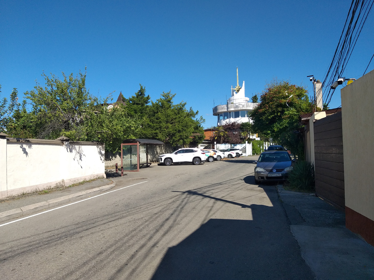 После посещения смотровой площадка на башне «Роза ветров» на горе Батарейка я направился вниз, к морю. Сначала я немного прогулялся по Альпийской улице. Шел по картам Яндекса. Далее свернул на дорожку, которая вывела меня к Сочинской телебашне. Вблизи телебашня смотрится как-то романтично. Я ее обошел по почти лесной тропинке и вышел на территории какого-то предприятия. Днем здесь можно пройти и выйти на Первомайскую улицу. А вот здесь уже полная мешанина частных домов, хрущевок и огромных современных ЖК. Все обочины улицы забиты припаркованными автомобилями. Но тротуар имеется, и я без проблем спустился к Курортному проспекту. И отправился купаться на уже привычный пляж «Маяк». В третий полностью пляжный день я уже понял, что надо быть осторожным с приемом солнечных ванн. Но море было ласковым, прибой слабым, и я купался и загорал почти 2 часа. Далее я решил продолжить прогулки по центру Сочи. Но сначала я плотно пообедал в столовой «Сели Поели» на Навагинско