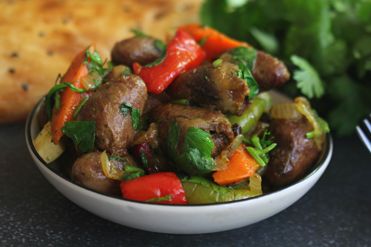 Встретился еще один удачный рецепт приготовления куриных сердечек. Если в прошлом рецепте сердечки нужно было разрезать, то тут сердечки будут целые, а это облегчает процесс подготовки, меньше возни. Сердечки будут мягкие, а в целом блюдо получается яркое, сочное и очень ароматное. Количество овощей всегда можно увеличить или уменьшить, зелень добавьте ту, которая нравится именно вам. Если вы не любите куркуму, не отвергайте ее тут совсем и добавьте хотя бы щепоточку. Куркума дает этому блюду замечательный цвет и очень уравновешивает вкус блюда. Болгарские перцы хорош взять разных цветов, блюдо будет ярче и аппетитнее. Это блюдо готовится на сильном огне, но если вы любите тушеные сердечки, то вместе с морковью и перцами можно влить 200 мл. воды, убавить огонь и тушить блюдо 20 минут. Куриные сердечки - 1 кг. Лук репчатый - 1-2 шт. Морковь - 1 шт. Перцы болгарские - 1-2 шт. Петрушка, укроп, кинза - по несколько веточек Чеснок - 3-4 зуб. Масло оливковое - 4 ст.л. Карри - 1 ч.л. Паприка
