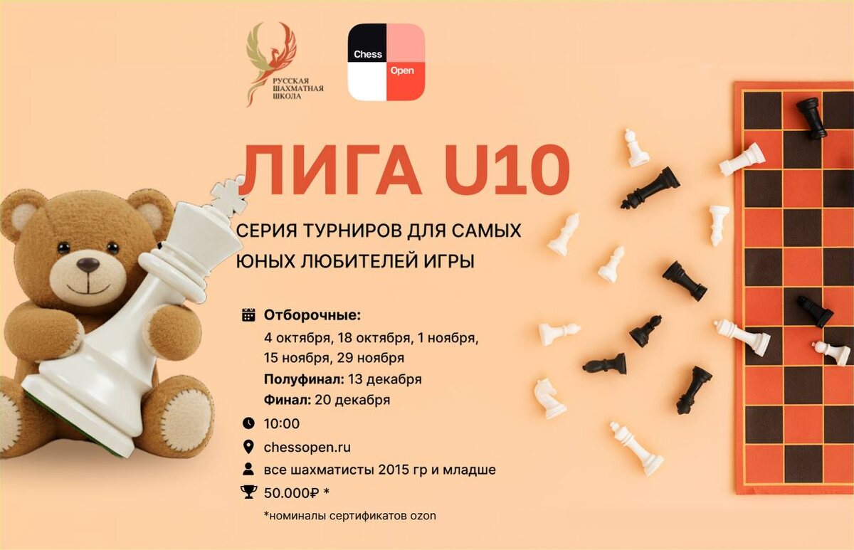 ChessOpen: ЛИГА U10 - серия онлайн турниров для самых юных любителей игры! Открываем регистрацию на серию игр ЛИГА U10, где юные шахматисты будут сражаться на ChessOpen, чтобы разыграть 50.000₽ Ждём всех смелых и решительных! Начинаем 4 октября Кто участвует: Все желающие шахматисты 2015 гр и младше Контроль: 5+3 Формат: швейцарка (7 туров) + нокаут Расписание отборочных игр: 4 октября, 18 октября, 1 ноября, 15 ноября, 29 ноября Полуфинал: 13 декабря Финал: 20 декабря 📄Положение ЛИГА U10 ❗️Заявки принимаются до 3 октября 12:00 Как зарегистрироваться: Шаг 1: регистрация на платформе ChessOpen (инструкция) Шаг 2: регистрация на турнир Шаг 3: добавиться в чат техподдержки Организатором турнира является Русская Шахматная Школа, обеспечивая призовой фонд для участников. Официальная площадка соревнований - шахматная платформа ChessOpen.ru Подробнее о турнире и призах на сайте. До встречи 4 октября!