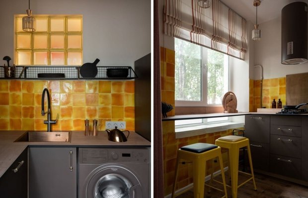 Небанальные бюджетные решения для вашего вдохновения! Эту кухню в двухкомнатной хрущевке обустроила Настасья Дуленко для себя и дочери-подростка. Главной задачей было сохранить историческую ценность жилья и одновременно создать современный и функциональный интерьер. Чтобы сделать пространство более функциональным, дверь на кухню перенесли на другую стену. Благодаря грамотным и продуманным решениям, кухня площадью всего 6 кв. м. получилась стильной и очень удобной. Окно между санузлом и кухней оставили и немного расширили, оформив его стеклоблоками. Затирку подбирали в цвет плитки на фартуке. Настасья, будучи керамистом, сделала плитку для фартука сама и покрасила ее — плитка выглядит очень стильно и даже напоминает итальянскую. От верхних фасадов отказались, предусмотрев лишь полку на одной стене, что визуально облегчает пространство. В нижних секциях достаточно мест для хранения. Настасья самостоятельно покрасила вытяжку, холодильник и стиральную машинку в тон гарнитура, придав кухне