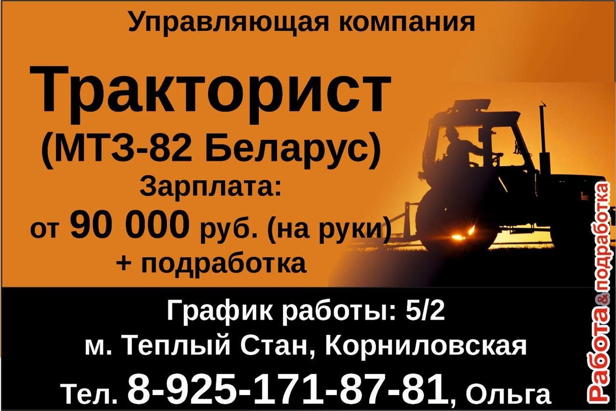 Тракторист в управляющую компанию (МТЗ-82 «Беларусь») Работа в районе м. Теплый Стан Обязанности: - Управление трактором МТЗ-82 «Беларусь»; - Выполнение сельскохозяйственных и коммунальных работ; - Поддержание техники в исправном состоянии. График работы: 5/2, с 8:00 до 17:00. Зарплата: от 90 000 рублей (на руки) + возможность подработки. Преимущества: - Официальное оформление по ТК РФ; - Стабильный заработок и возможность дополнительного дохода. Контактная информация: м. Теплый Стан, Корниловская Телефон: 8-925-171-87-81, Ольга Работа&Подработка «Вы не можете заключить хорошую сделку с плохим человеком.» — Уоррен Баффет #тракторист #трактористы #требуетсятракторист #водительтрактора #машинисттракторист #машинисттрактора #машинисттракторамтз #водитель #комунальщики #работаподработка #поискработы #работамосква #вакансиимосква #работадлявсех #теплыйстан #работа #вакансии #работавакансии #работадлямигрантов #работабеженцам #мфц #центрзанятости #трудоустройство #роструд #минтрудрф