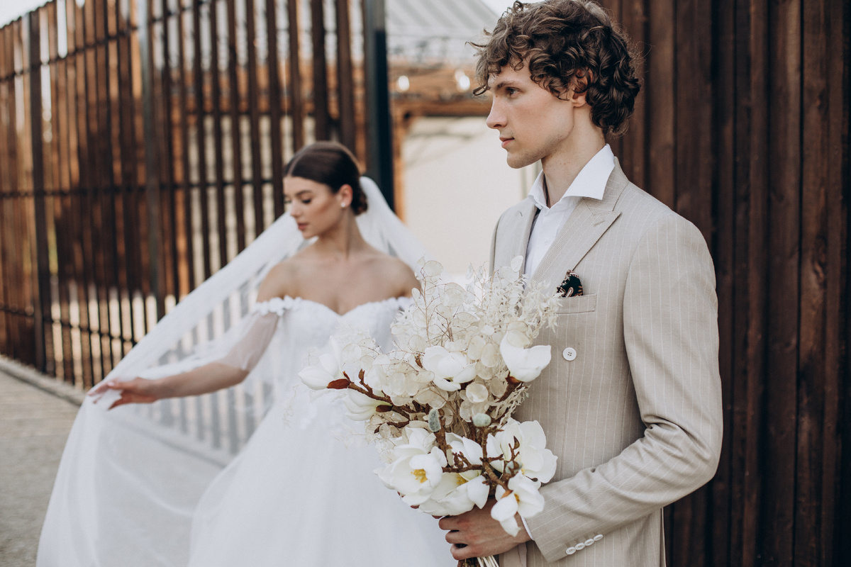Важный тренд — уникальные элементы, которые делают наряд «только вашим». Это может быть вышивка с инициалами пары, украшения ручной работы или аксессуары, созданные специально для свадьбы. Платья и костюмы перестают быть универсальными.