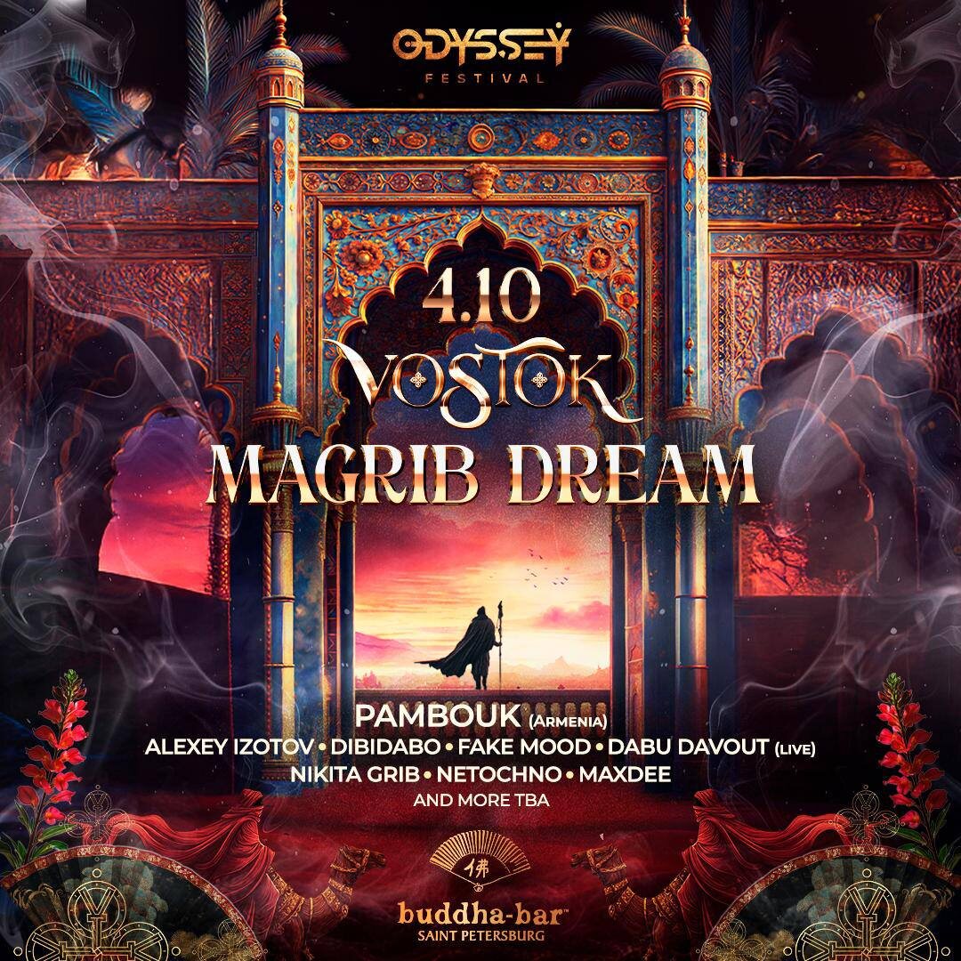 VOSTOK в BUDDHA BAR СПб 4 октября Ветер самум принёс обжигающую весть: ВОСТОК ГРЯДЁТ! Odyssey festival в лучших проявлениях. Декорации, наряды, джины и духи пустынь: PAMBOUK (Armenia) • ALEXEY IZOTOV • DIBIDABO • FAKE MOOD • DABU DAVOUT (live) • KENSHO • MAXDEE • NETOCHNO • NIKITA GRIB MAGRIB DREAM уже звенит золотыми дирхамами – успей открыть свой Восток этой тёмной и пряной магрибской ночью в Будда-Баре! 🎫 Билеты FC DC 📆4 октября 2025, 22:00 📍 Buddha-Bar, Синопская наб., 78, Санкт-Петербург
