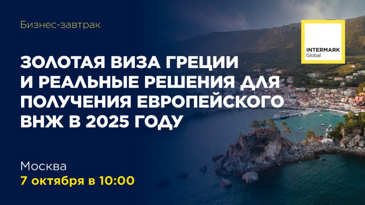 🇬🇷 Приглашение на бизнес-завтрак в Москве "Золотая виза Греции и реальные решения для получения европейского ВНЖ в 2025 году" Европа становится всё дальше. Сегодня получить визу в ЕС для россиян — почти квест: сроки увеличиваются, визы всё чаще отклоняют, а новые ограничения вводятся каждую неделю. На бизнес-завтраке эксперты Intermark Global разберут, как действовать сейчас, чтобы обеспечить себе и своим близким долгосрочную стабильность и новые возможности в Европе. 🕗7 октября, 10:00 📍Москва ❗️Количество мест ограничено. Предварительная регистрация обязательна ➡️ Чтобы зарегистрироваться на мероприятие, оставьте заявку по ссылке