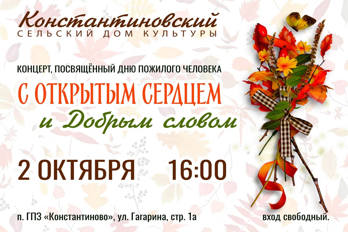 ✨ День мудрости, добра и уважения! 🧡 Приглашаем вас на праздничный концерт, посвящённый Дню пожилого человека! Это прекрасный повод выразить свою любовь и благодарность нашим дорогим старшим поколениям. Ждём всех, кто готов подарить тепло своих сердец и разделить праздник! 📆 02.10.2025🕒16:00 🏢 Константиновский сельский дом культуры (СДК) 📍 г.о.Домодедово, пос.Государственного племенного завода Константиново, ул.Гагарина, д.1А 💰 Вход свободный❗️ ✅ Мероприятия Домодедово https://dzen.ru/id/66f10385cc4c5a16f7b5fb02 http://vk.com/domodedovo_events http://dzen.ru/domodedovo_events