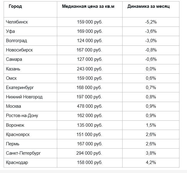 Наиболее ощутимый рост цен в новостройках в сентябре зафиксирован в Краснодаре (+4,2%), Санкт-Петербурге (+3,8%) и Перми (+2,6%), в то время как стоимость упала в Челябинске (-5,2%), Уфе (-3,6) и Волгограде (-3%). Квартиры на первичном рынке недвижимости заметнее всего подешевели в Челябинске (-8,4%), Волгограде (-3,6%), а также Уфе (-2,5%).