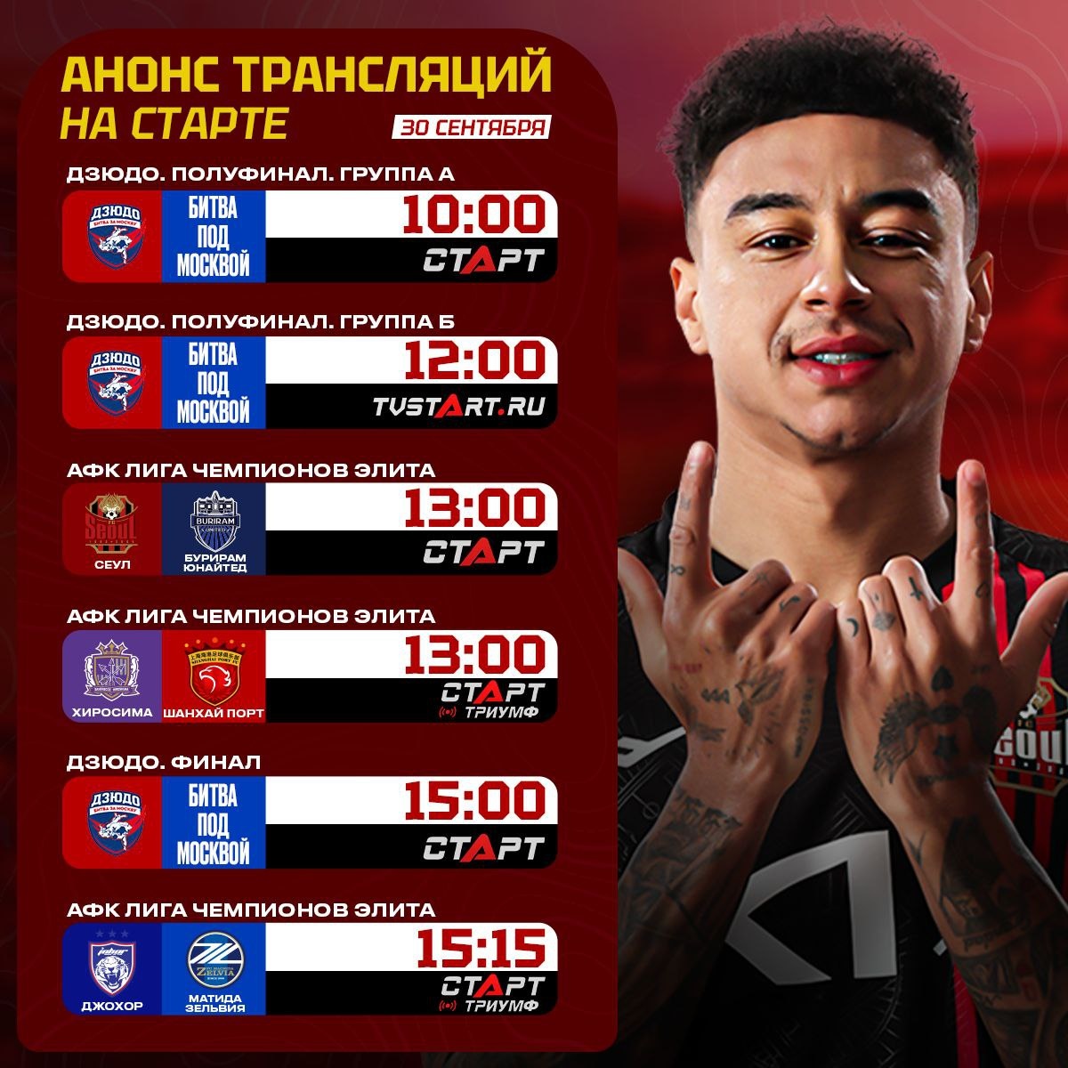 🍿📺 Вторник на TVSTART.RU! Начнем его с решающих схваток на татами «Битвы под Москвой». Дальше откроем второй тур АФК Лига Чемпионов Элита для команд Восточной конференции. Вечером увидим два топ-матча на Западе. «Аль-Садд» Роберто Фирмино сыграет с «Аль-Шаржей», затем «Аль-Иттихад» Карима Бензема сразится против «Шабаба Аль-Ахли» Сердара Азмуна. Проведите этот день на TVSTART.RU 🖥 🛒 Наше приложение в Google Play 💙 Наше приложение в RuStore 🛒 Наше приложение в App Store