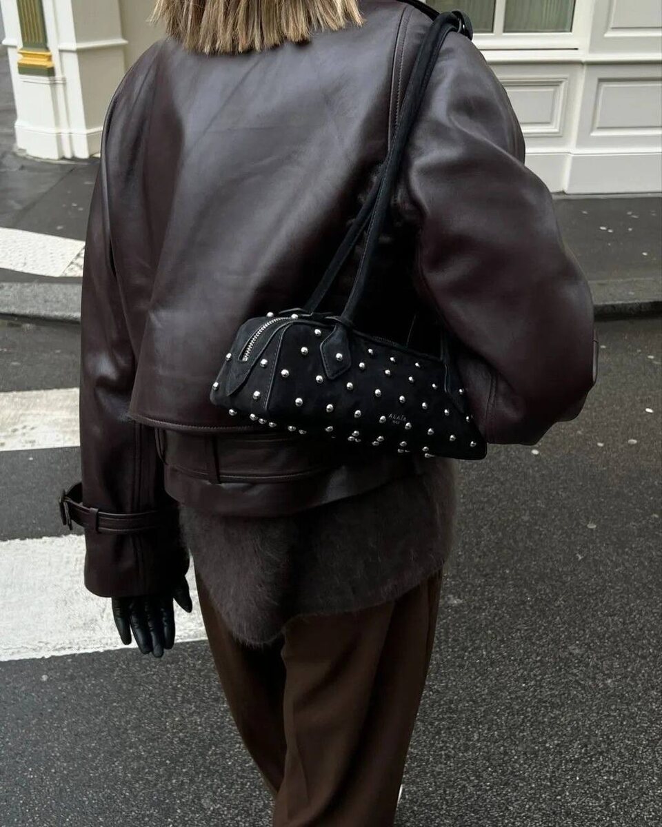 Если хочется добавить в образ лёгкий акцент — присмотритесь к сумке с заклёпками