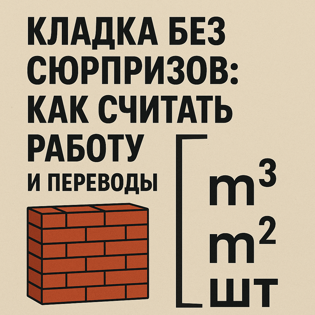 Базовая геометрия: ⚠️ Швы учитываем так: кирпич — ориентируйся на нормативные таблицы (там уже заложены ~10 мм швы), блоки — к расчётам добавляй 3–5 % на подрезки, а шов клея считаем минимальным. Размеры кирпича (мм): одинарный 250×120×65, полуторный 250×120×88, двойной 250×120×138.