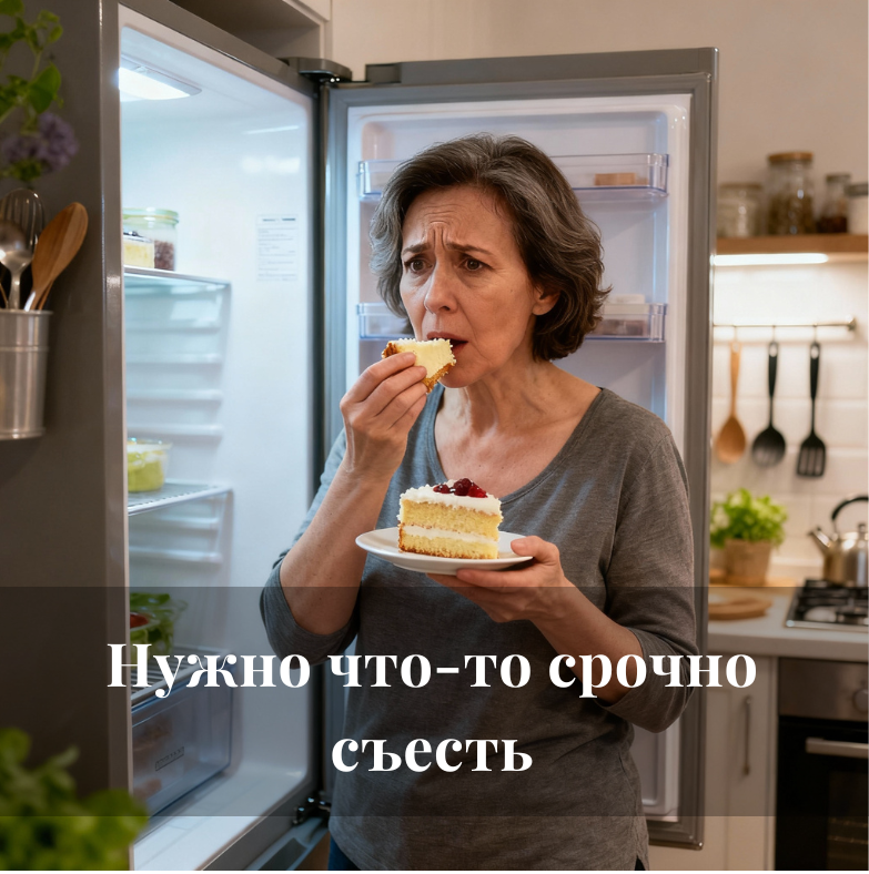 У вас было такое? День был тяжёлый, нервы на пределе, и вот вы уже стоите у холодильника. Не потому что голодны, а потому что душе больно, а еда временно это заглушает. Это называется эмоциональное переедание. И с возрастом эта связка «стресс-еда» только крепчает. Вы думаете, такое только у вас? Нет, почти у всех и у меня в том числе случаются такие «зажоры». Когда нам плохо, мозг ищет быстрый способ получить удовольствие – это банальная нейрофизиология. Сладкое, жирное, мучное мгновенно повышают уровень «гормонов счастья». Негативная эмоция ушла? Проблема решена? Нет, просто отложена. А дальше включаются чувство вины, стыд за слабость, ещё больший стресс. И снова — к холодильнику. Вот и замкнутый круг. Еда становится единственным доступным антидепрессантом. Но эффект кратковременный, а последствия накапливаются. Как же распознать эмоциональное переедание А теперь — самое важное! Всё это можно изменить. И начинается изменение не с диет и ограничений, а с пересмотра убеждений, ведь имен