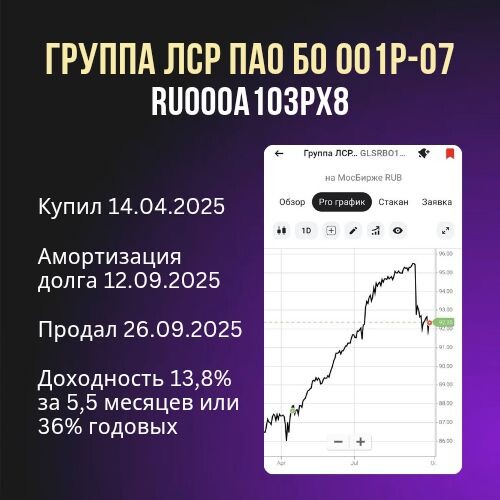 12-ю сделку совершил с облигациями федерального застройщика Группы ЛСР. Купил облигации компании в середине апреля при формировании облигационной части портфеля с целью заработать на росте их курсовой стоимости. Условия выпуска облигаций предусматривают погашение номинальной стоимости облигаций частями, т.е. амортизацию долга. 12 сентября Эмитент погасил 40% номинальной стоимости облигации равной 1 000 рублей и на брокерский счет поступила оплата исходя из расчета 400 рублей на