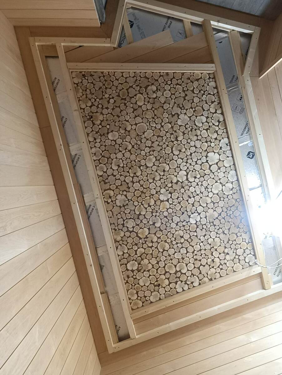 Потолок из можжевеловых спилов. Выполнены работы по монтажу декоративной части потолка в парной: Несущая конструкция: Каркас из бруса 100х50