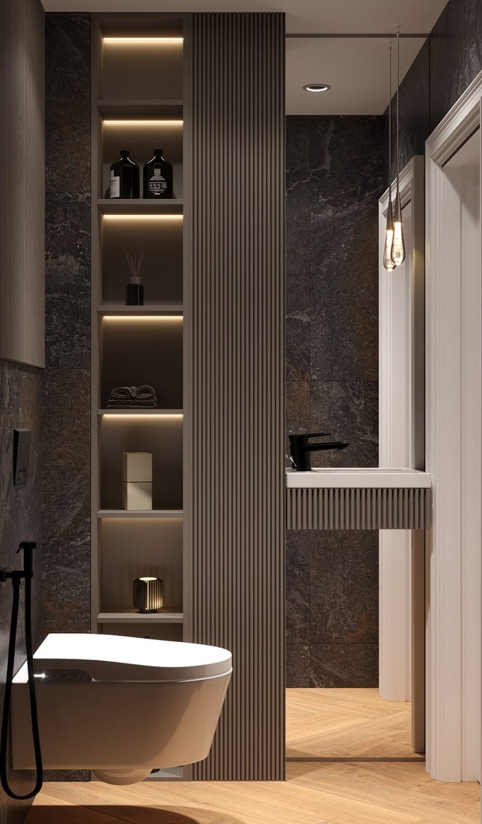 ✨ Минимализм в деталях Этот санузел — пример того, как даже маленькое пространство может выглядеть стильно и современно. Мы сделали ставку на чистые линии, приглушённые оттенки и текстуры, которые создают ощущение уюта и гармонии. 🔹 Парящая подвесная чаша визуально облегчает интерьер. 🔹 Нейтральная палитра с акцентом на камень и дерево добавляет глубины. 🔹 Скрытая подсветка в нишах создаёт мягкую атмосферу и подчеркивает геометрию. 🔹 Функциональность — на первом месте: всё под рукой, но ничего лишнего. Такой туалет не просто часть квартиры, а полноценный элемент интерьера, где сочетаются эстетика и комфорт. Хотели бы себе такой дизайн? 🙂