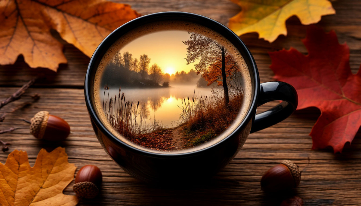 Зачарованный рассвет осени В центре деревянной поверхности, словно застывший миг вечности, возвышается черная фарфоровая чаша. Ее гладкая поверхность отражает мельчайшие блики, придавая образу загадочность и таинственность. Внутри чашки сверкает густая кофейная пена, мягко переливающаяся оттенками золотого заката. Но главное чудо скрывается в отраженном свете и объемном изображении. Над поверхностью напитка возникает гипнотическое трехмерное изображение: озеро окутано нежным утренним туманом, сквозь который пробиваются лучи теплого солнечного света. Вода мерцает тысячью оттенков желтого и оранжевого, создавая иллюзию магической энергии. Рядом виднеются золотые березы и красные рябины, согретые теплом поздней осени. Их тени скользят по земле, постепенно погружаясь в мягкие объятия теней вечерних сумерек. Тонкий лучик солнца проникает сквозь ветви, заставляя оживать пейзаж, наполняемый глубокими зелеными красками листьев, золотыми искрами трав и ярким свечением горизонта. Вокруг лежат св