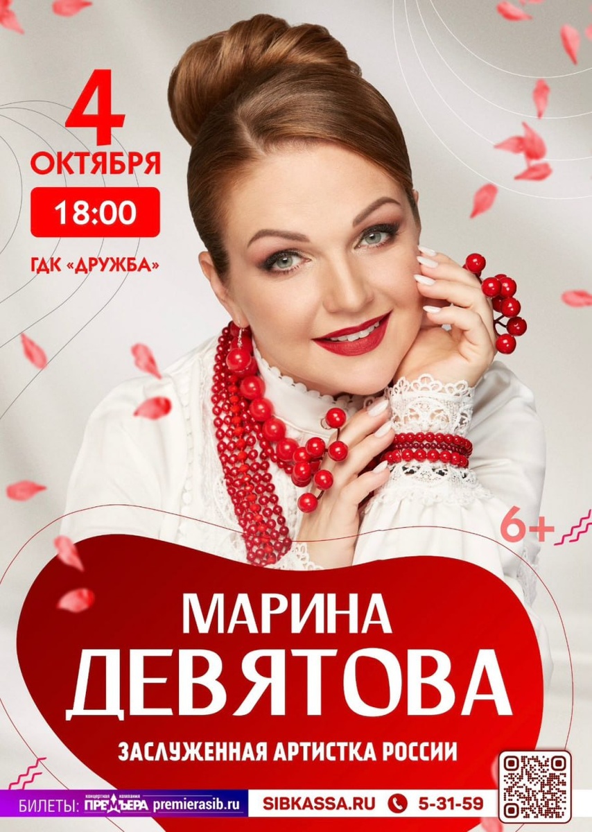 Дорогие друзья! Приглашаем вас на сольный концерт популярной певицы Марины Девятовой! Заряд душевности и хорошего настроения вам обеспечен! Марина споет для вас все самое любимое: от романса до классики, от залихватской народной песни до любовной лирики. Марина Девятова – обладательница классического музыкального образования, выпускница Академии имени Гнесиных, исполнительница народных песен и романсов. Кроме того, она является Послом русской культуры в странах мира, Лауреатом многочисленных Международных фестивалей и конкурсов. Искренняя, душевная, открытая и невероятно талантливая певица с истинно русским характером – Марина Девятова рада новой встрече со зрителем. Каждый раз, выходя на сцену, она превращает обычный вечер в праздник, наполненный любовью и добротой. Ее творчество отмечено искренностью и душевностью. И как уверена сама певица, именно в песнях, слагаемых народом, люди испокон веков выражали свои мысли, взгляды, традиции, описывали важные исторические события, жизненн
