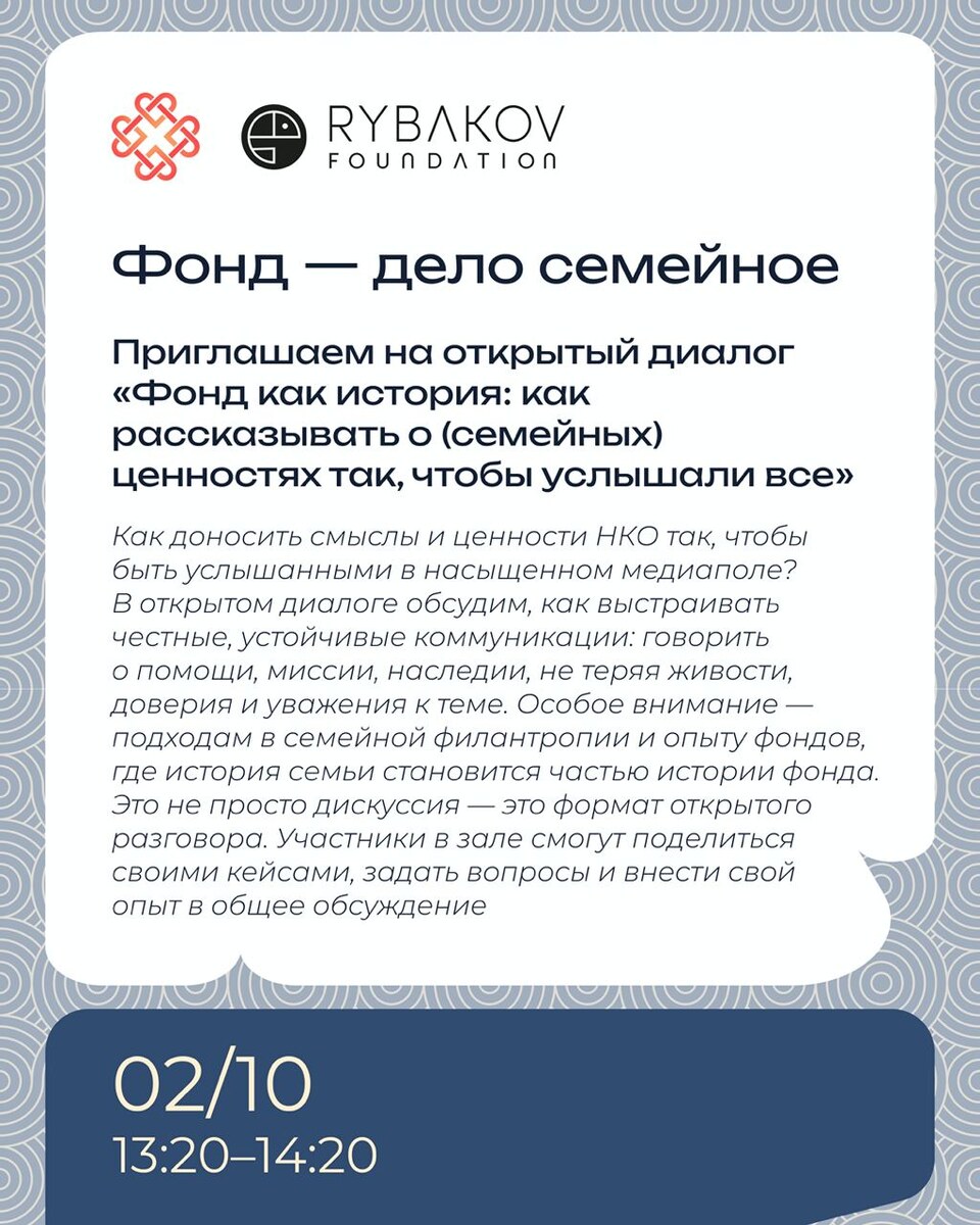 Как говорить так, чтобы быть услышанным? И так, чтобы захотели слушать снова? В некоммерческом секторе коммуникации — это не просто способ «рассказать, что мы делаем». В случае фондов, общественных инициатив и проектов, работающих с уязвимыми темами, коммуникации всегда становятся разговором про ценности. Они помогают формировать доверие (или наоборот, не формируют его) и становятся отражением устойчивых смыслов — того, во что действительно верит организация В семейных фондах в этот разговор вплетается ещё и личная история: голос семьи, взгляды, опыт, культура взаимодействия. Как говорить об этом — тактично, глубоко, с уважением? Как рассказывать о миссии, помощи, наследии — не теряя искренности и связи с живыми людьми? 2 октября на форуме «Фонд — дело семейное» состоится открытый диалог «Фонд как история: как рассказывать о (семейных) ценностях так, чтобы услышали все» Вместе с экспертами из крупнейших фондов и коммуникационных команд обсудим: — зачем НКО вообще нужны коммуникаци