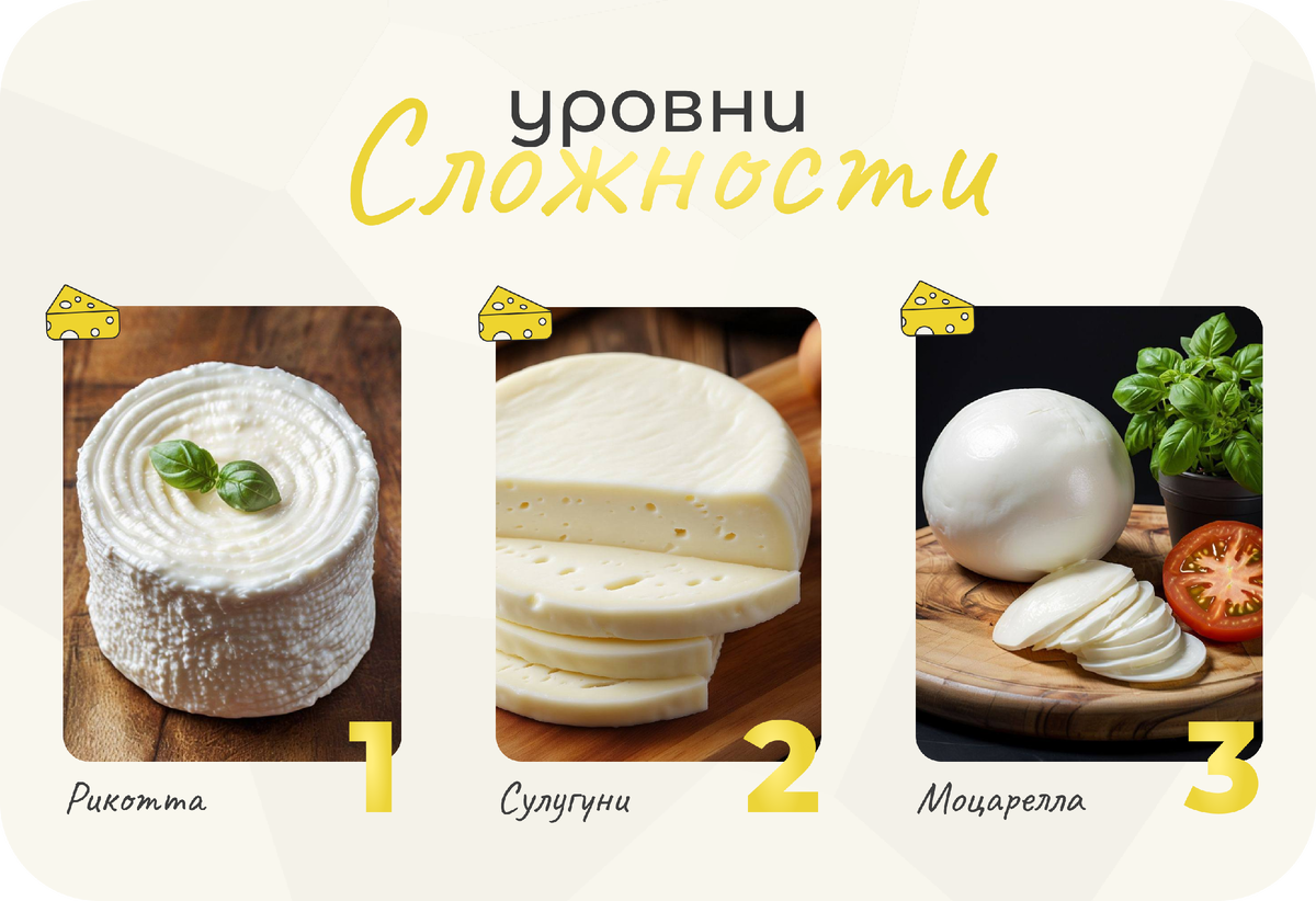 Приготовить настоящий сыр дома — не магия, а приятный ритуал. Не нужно быть профессиональным сыроваром, чтобы баловать себя и близких домашней моцареллой, аппетитным чеддером или нежной страчателлой. Рассказываем, как легко начать это делать. Сыроварение — это не сложно. Мы разделили сыры на 3 категории сложности, чтобы вы могли прогрессировать от простого к сложному, не перегружая себя. Идеальный способ быстро получить результат и поверить в свои силы. Никакого сложного оборудования, только молоко, закваска и простые действия. Что приготовите: Адыгейский, Качотта, Козий, Фета, Рикотта, Брынза, Халуми. Результат: Уверенность в своих силах и первый домашний сыр. Для тех, кто освоил азы и готов к новым вершинам. Здесь технологии интереснее, а вкусы — насыщеннее. Что приготовите: Гауда, Сулугуни. Результат: Освоение новых техник и сыры, которые удивят ваших гостей. Высший пилотаж домашнего сыроварения. Сложная рецептура, выдержка и терпение, которые вознаграждаются безупречным вкусом. Ч