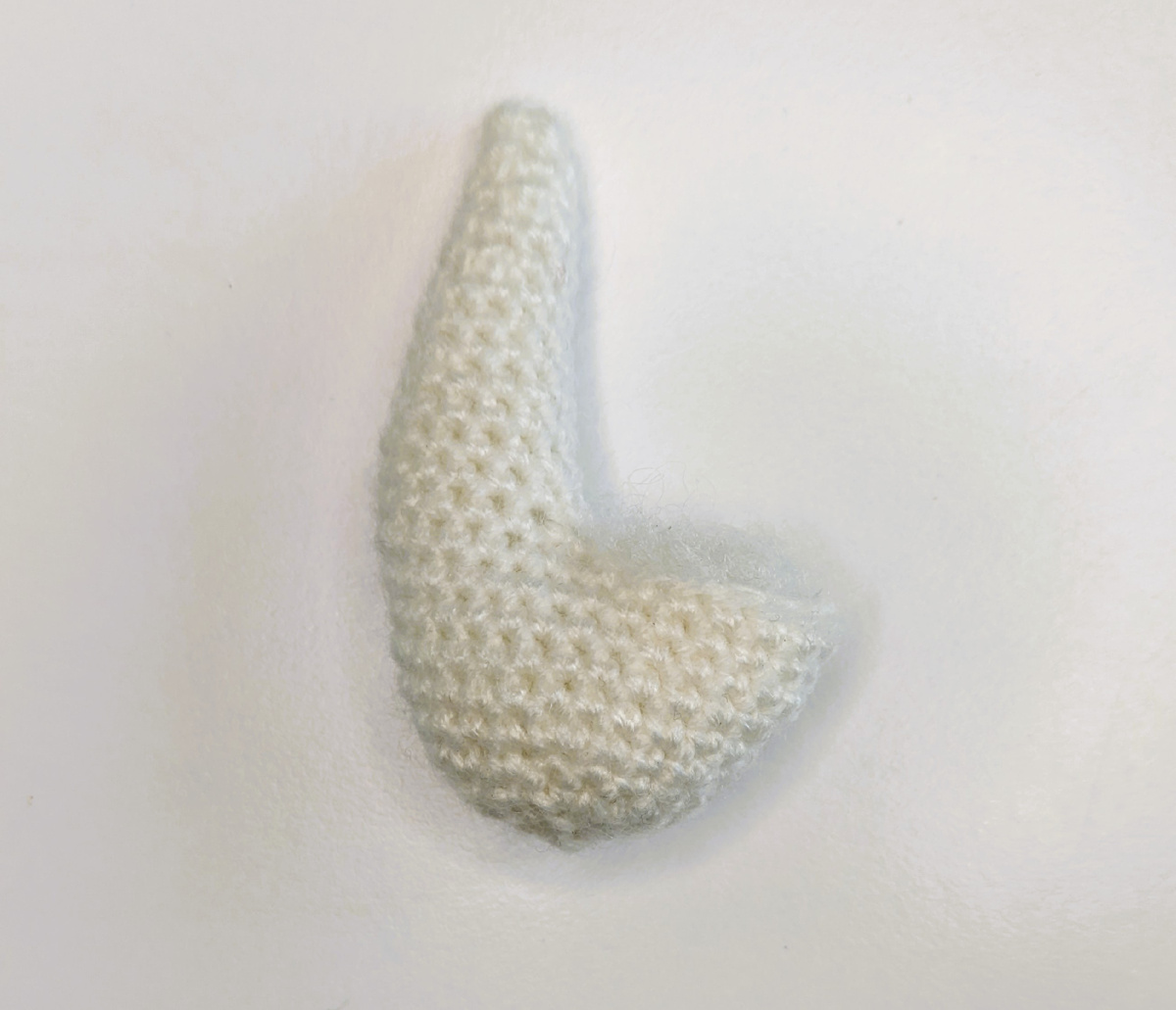 В продолжении рога ввела нить в середину 10го ряда. Повторила с 11го по 24й ряды предыдущего рога. После завершения 11го ряда может остаться отверстие. Аккуратно проденьте белой пряжей в это отверстие и не очень туго стяните отверстие.