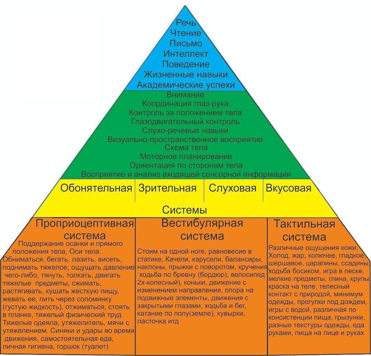 🟣 Почему важно начинать с АФК, а не сразу с речи Посмотрите на пирамиду. На вершине — то, чего ждут родители: речь, чтение, письмо, интеллект, поведение, академические успехи. Но всё это держится на фундаменте — на сенсорных системах (вестибулярной, проприоцептивной, тактильной и других). Именно они формируют внимание, координацию, моторику, восприятие и умение управлять своим телом. ❗ Часто родители тратят время и силы только на запуск речи, игнорируя то, как речь вообще должна запускаться. А запускается она через тело, через движение, через сенсомоторный опыт ребёнка. Если база не сформирована, речь идёт с задержкой или развивается некачественно. А когда фундамент прочный — речь появляется естественно и легче, вместе с вниманием, мышлением и учебными навыками. 📌 Поэтому АФК — это не про спорт, а про создание условий для речи и интеллекта. Сначала укрепляется тело, и только потом можно ожидать устойчивого развития речи и высших функций. 📌 Сначала тело, потом слова. ✨ Запишит