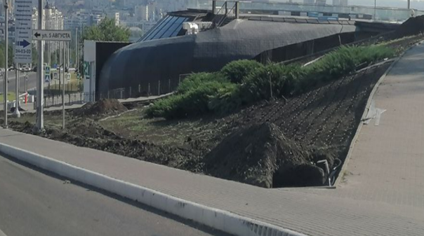 Несмотря на достигнутые договоренности о взаимодействии с велосообществом и координации действий, летом 2025 года на этом участке выполнили работы по устройству полива зеленых насаждений, высадили новый газон и организовали клумбы. Клумба получилась действительно красивая. Но проблема в том, что трубы полива и газон проложили в том числе в зоне прохождения будущей велодорожки. Теперь осуществить работы по расширению тротуара без перекладки сетей полива и перекладки газона - невозможно. Об этом велосообщество неоднократно сообщало. Но на это внимания не обратили.