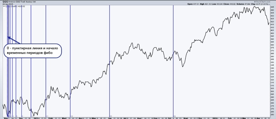 Эти линии проходят вдоль оси дат, отмечая ожидаемые интервалы, в которых могут произойти развороты, в зависимости от прошедшего времени. Хотя отправная точка часто исходит из большого минимума или максимума, расстояния между этими зонами начинаются относительно небольшими и растут в соответствии с последовательностью Фибоначчи. Хотя зоны Фибоначчи не всегда точны, они являются ценным инструментом прогнозирования для прогнозирования потенциальных точек разворота цен.
