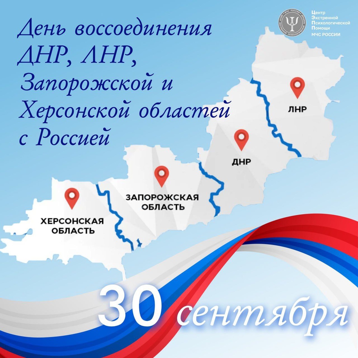 ❤️ С Днём воссоединения новых регионов с Россией! 🇷🇺 Сегодня отмечается третья годовщина воссоединения Донецкой и Луганской Народных Республик, Запорожской и Херсонской областей с Российской Федерацией. ➡️ Все это время ведется колоссальная работа по их интеграции в социально-экономическое пространство страны. Люди очень многих профессий вовлечены в приоритетные задачи по укреплению регионов и улучшению качества жизни людей. 🤲 Психологическая служба МЧС России, как и вся страна, помогает людям как можно быстрее вернуться к мирной жизни, почувствовать любовь и заботу, всестороннюю поддержку и уверенность в будущем. 🕊 Команда Центра экстренной психологической помощи МЧС России поздравляет всех жителей страны с этим праздником и желает всем мира, семейного благополучия, новых побед и свершений! Подробнее о новостях психологической службы МЧС читайте на нашем сайте. 🌐 Подписывайтесь на наш канал @ceppmchs 🌐 Мы в Дзен 💬 Задать вопрос психологу на сайте Интернет-службы экстренн