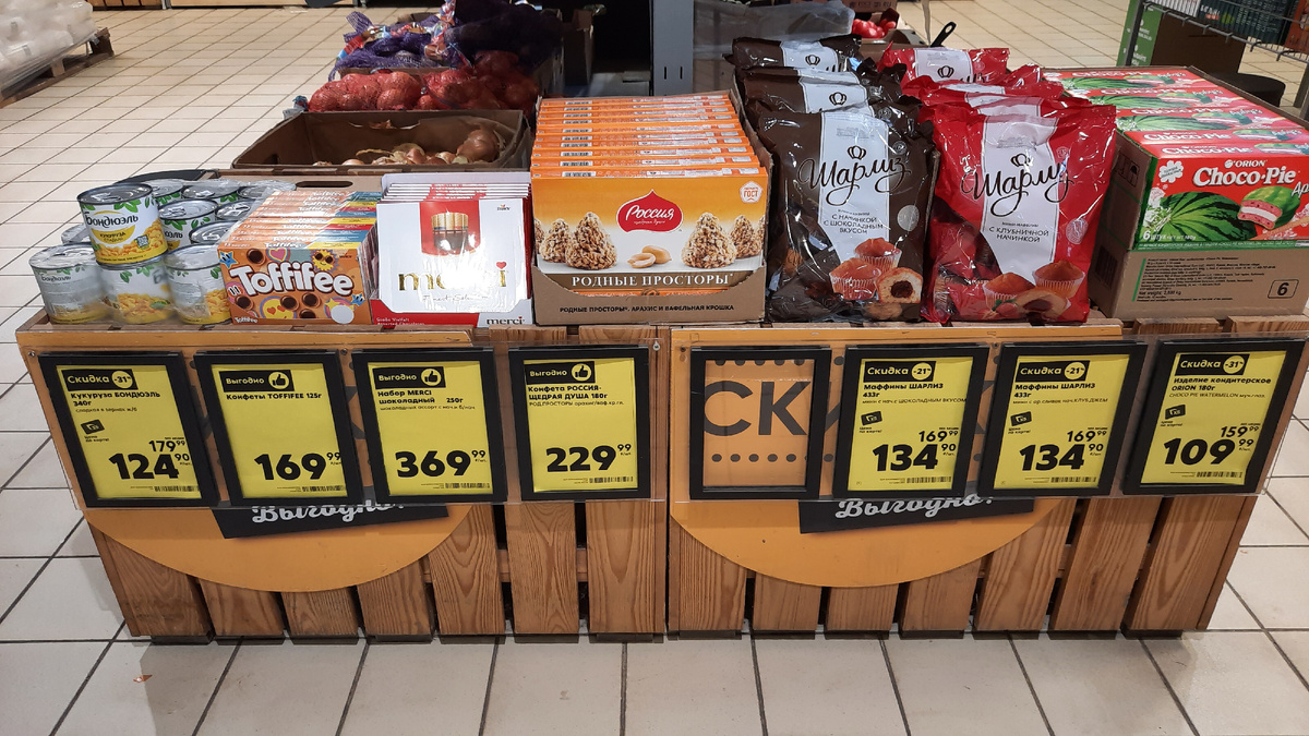 В Пятёрочка началась новая неделя скидок. Покажу вам товары со скидкой по карте. Приветствую вас, мои дорогие друзья и подписчики. Магазин находится по адресу Ростовская область, Зерноградский район, станица Мечетинская, улица Ленина, 62 Кукуруза Бондюэль сладкая в зёрнах ж/б 340 г цена со скидкой по карте 124.90 рублей. Конфеты Toffifee 125 г цена 169.99 рублей. Набор Мерси шоколадный ассорти с начинкой и без начинки 250 г цена со скидкой по карте 369.99 рублей. Конфеты Россия-Щедрая душа Родные просторы 180 г цена со скидкой по карте 229.99 рублей. Маффины Шарлиз мини 433 г в ассортименте цена со скидкой по карте 134.90 рублей. Изделие кондитеское Орион Чоко Пай 180 г цена со скидкой по карте 109.99 рублей. Кофе Монарх Tropical Selection 180 г натуральный растворимый сублимированный цена 629.99 рублей. Сдобные палочки Шарлиз Снежка с малиновым джемом цена со скидкой по карте 129.90 рублей. Мини круассаны 7Days с кремом какао 265 г цена 119.99 рублей. Напиток Очаково