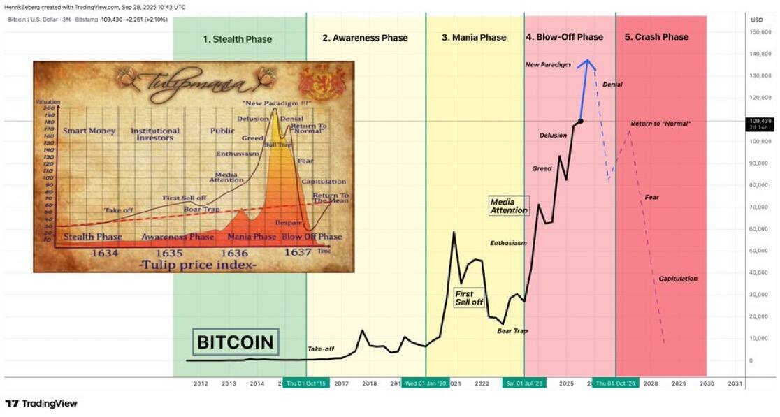 BITCOIN vs TULIPS: снова разговор о «пузыре» В сети снова ходит это картинка и всегда вызывает жаркие споры. Сравнение биткойна с тюльпаноманией XVII века звучит красиво, но не совсем честно. Да, у графика похожая форма. Да, эмоции на рынке — жадность, эйфория, отрицание — повторяются из цикла в цикл. Но разница в том, что за тюльпаном не стояла фундаментальная технология, которая могла изменить мировую финансовую систему. За биткойном стоит. Что это значит? Биткойн и правда проходит «пузырные» стадии: экспоненциальный рост, перегрев, крах, новая база. Но в отличие от тюльпанов, каждая «схлопнувшаяся волна» оставляет после себя инфраструктуру, новых участников, и более высокий уровень принятия. Ключевая мысль: биткойн — это не разовый пузырь, а серия пузырей внутри большого тренда. Каждый крах становится топливом для следующего цикла. Хотите, разберём подробно — чем «тюльпановая лихорадка» отличается от криптоциклов и почему история здесь рифмуется, но не повторяется? Поставьте ре
