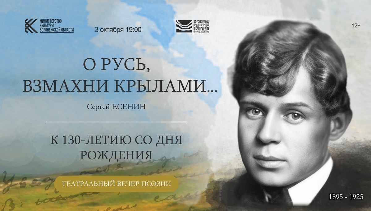 3 октября в 19:00 Воронежский театр драмы имени А. Кольцова приглашает ценителей поэзии на вечер «О Русь, взмахни крылами…», посвященный 130-летию со дня рождения Сергея Есенина. Мероприятие позволит зрителям погрузиться в творческое наследие поэта, с неповторимой искренностью воспевавшего красоту русской природы и глубину человеческих чувств. В программе вечера прозвучат стихотворения и поэмы Есенина, а также песни на его слова. Зрителей ждет знакомство с малоизвестными фактами биографии поэта и видеозаписи из села Константиново на Оке, где расположен дом-музей, привлекающий поклонников творчества со всей страны. Художественное чтение произведений будет представлено заслуженными артистами Воронежской области Юрием Смышниковым и Романом Слатвинским, а также артистом Евгением Чистяковым. Вечер станет данью памяти одному из самых лиричных поэтов Серебряного века и позволит по-новому открыть для себя его творческое наследие.
