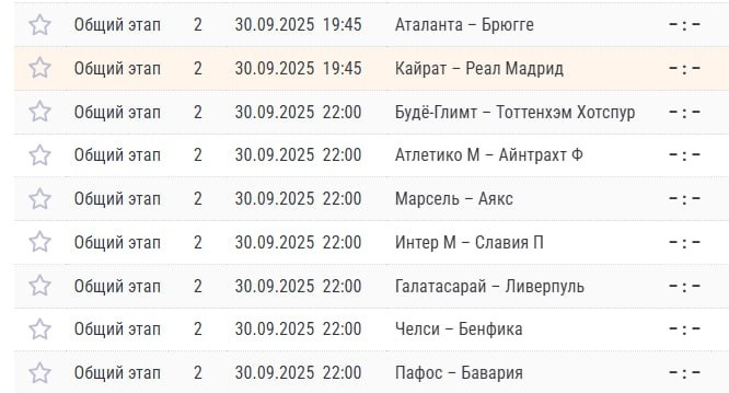 На мой субъективный взгляд, самые интересные пары: 🇰🇿Кайрат - 🇪🇸Мадрид, 🇫🇷Марсель - 🇳🇱Аякс, 🇮🇹Аталанта - 🇧🇪Брюгге