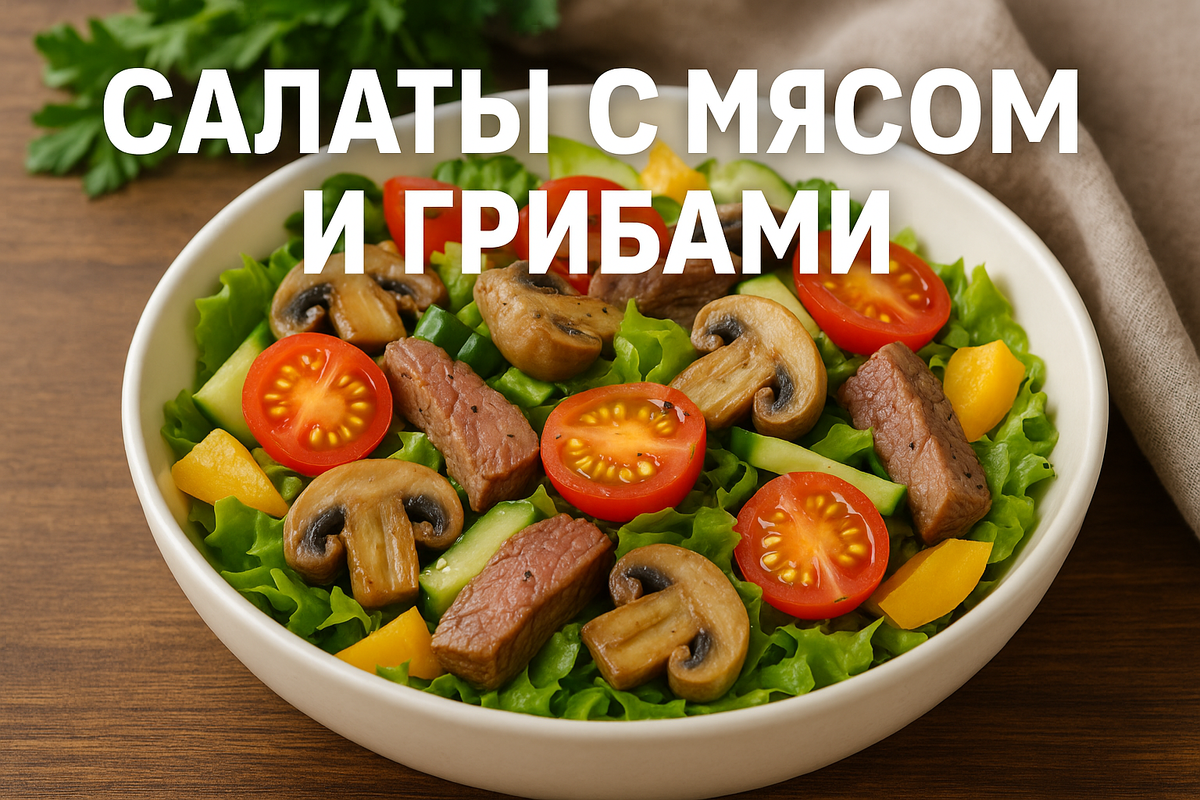 Салаты с мясом и грибами — это целый мир вкусов. Здесь и лёгкие комбинации с фетой и апельсином, и сытные блюда с сердцем и печенью, и праздничные варианты с языком, гранатом или перепелиными яйцами.