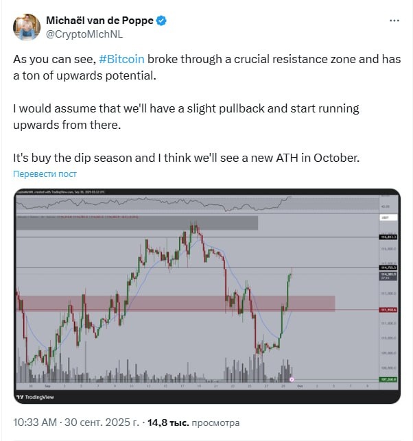 Как видите, биткоин пробил ключевой уровень сопротивления, и теперь у него огромный потенциал для роста. Полагаю, нас ждёт небольшая коррекция, после чего начнётся движение вверх. Сейчас - самое время покупать на откатах. Думаю, мы увидим новый исторический максимум в октябре.
