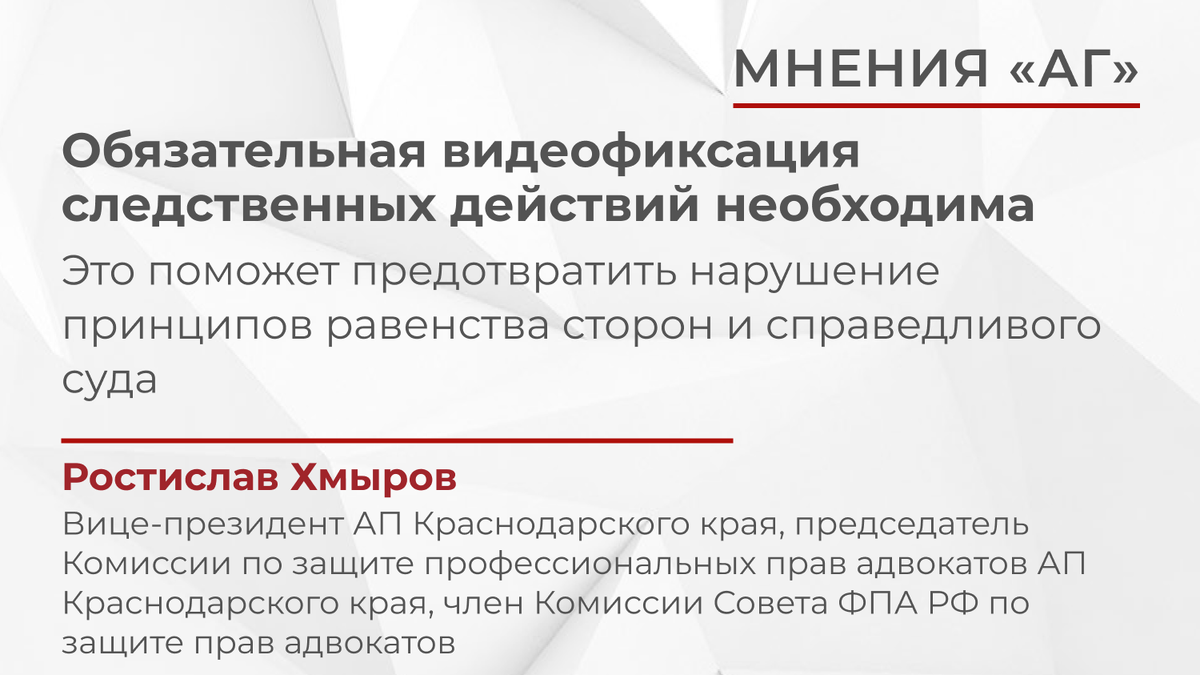 Вице-президент АП Краснодарского края, председатель Комиссии по защите профессиональных прав адвокатов АП Краснодарского края, член Комиссии Совета ФПА РФ по защите прав адвокатов Ростислав Хмыров о проблемах допуска адвокатов к участию в следственных действиях, необходимости обязательной видеофиксации данных действий.