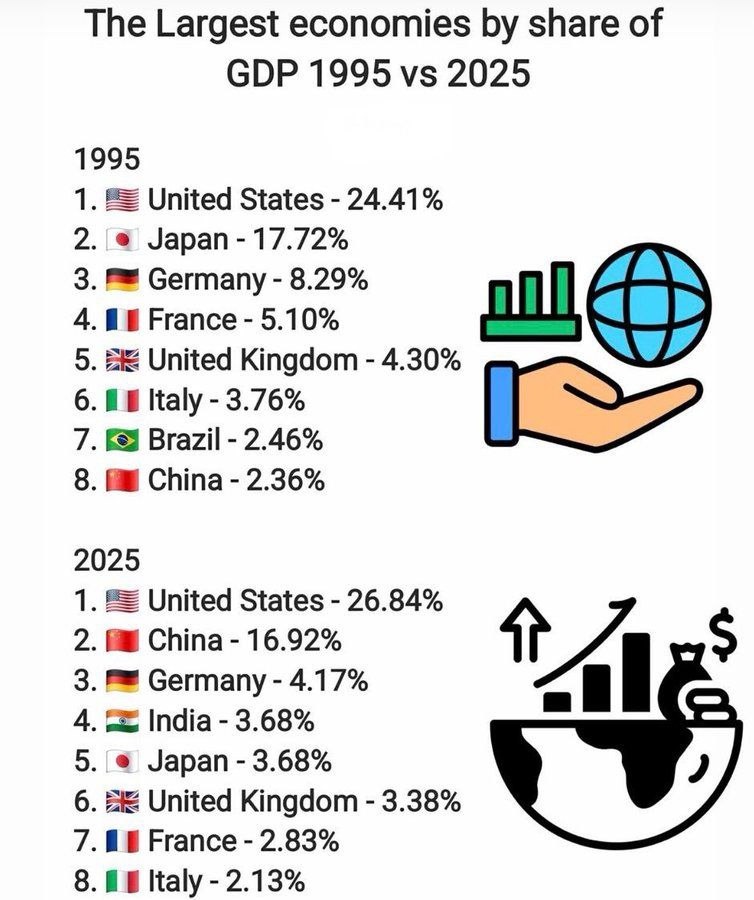 Мировая экономика за 30 лет: два главных сдвига 📊 С 1995 по 2025 год мировой ВВП кардинально перераспределился: 🇺🇸 США: Увеличили свою долю с 24.41% до 26.84%. Почему?Технологический бум, гибкая экономика и статус доллара 🇨🇳 Китай: Совершил рывок с 2.36% до 16.92%, сместив Японию с 2-го места. Почему?Стал "фабрикой мира" и провел масштабные реформы 🇯🇵 Япония: Их доля упала с 17.72% до 3.68%. Почему?"Потерянные десятилетия" после пузыря на рынке и демография Итог: Экономика стала биполярной с двумя центрами силы — США и Китаем #статистика_ДенисКосьяненко