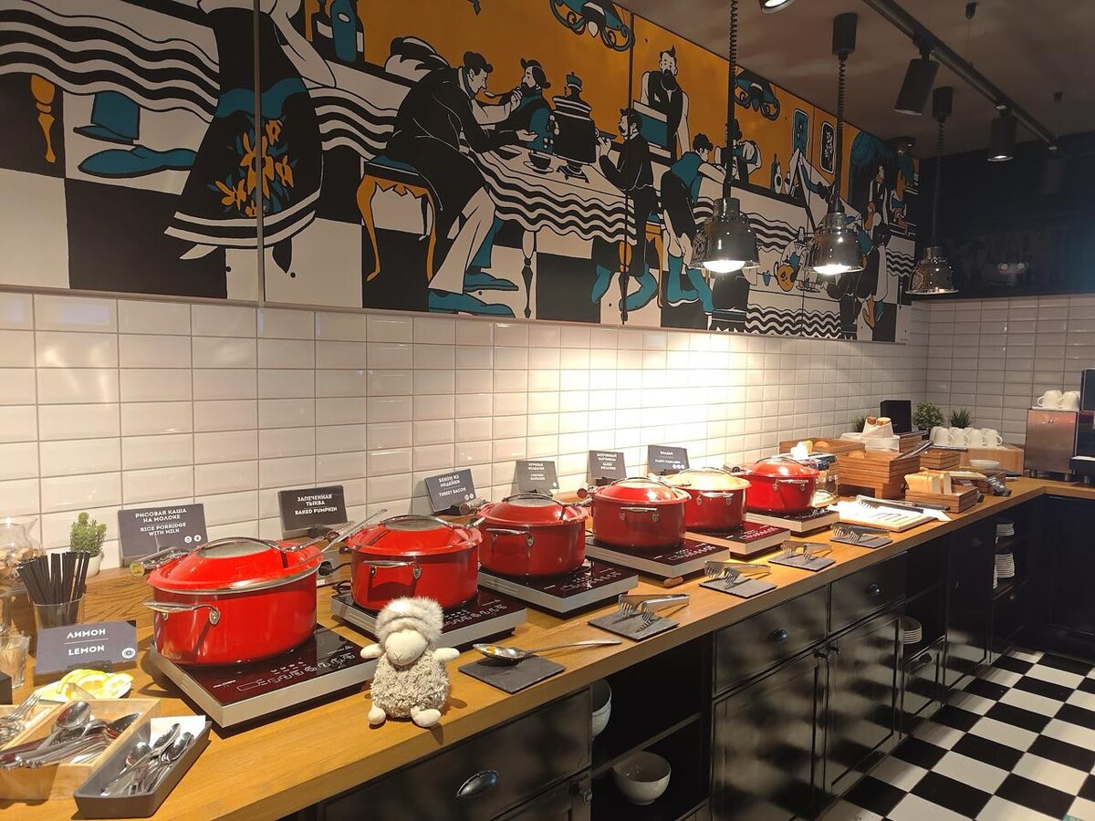 Красные кастрюли скрывают полный набор утренней классики: рисовая каша, запечённая тыква, бекон, сосиски, картошка и оладушки. Рядом — овощи и соленья для тех, кто «по ЗОЖу», а для сладкоежек — блины с вареньем. Фруктовый раздел — арбузы, дыни, яблоки и сливы. Овца Борис, конечно, сделал вид, что всегда на завтрак ест только полезные фрукты, но потом незаметно перешел на селёдку и копченый лосось с тостами. Финальный сет на нашем столе выглядел внушительно: яичница с яркими желтками, блин с кленовым сиропом, творог с ягодным вареньем, смузи яблоко/шпинат, чайник с чаем и тот самый бокал игристого. Цена завтрака в Penta Hotel Москва, Арбат — 2500 руб. за гостя, и это, кажется, тот случай, когда «всё включено» действительно работает: от игристого до овсянки. И так каждый день с 7 до 11 утра. #penta
