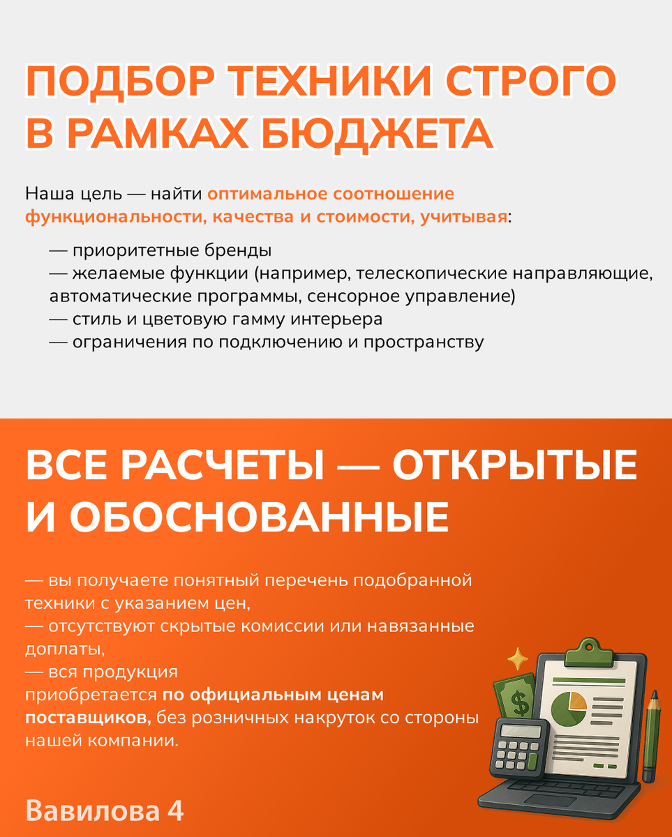Мы придерживаемся принципа прозрачности и ответственности на всех этапах подбора встраиваемой техники. Один из ключевых — подбор оборудования в рамках утверждённого бюджета. 💼 Мы не предлагаем модели по принципу «дороже — значит лучше».