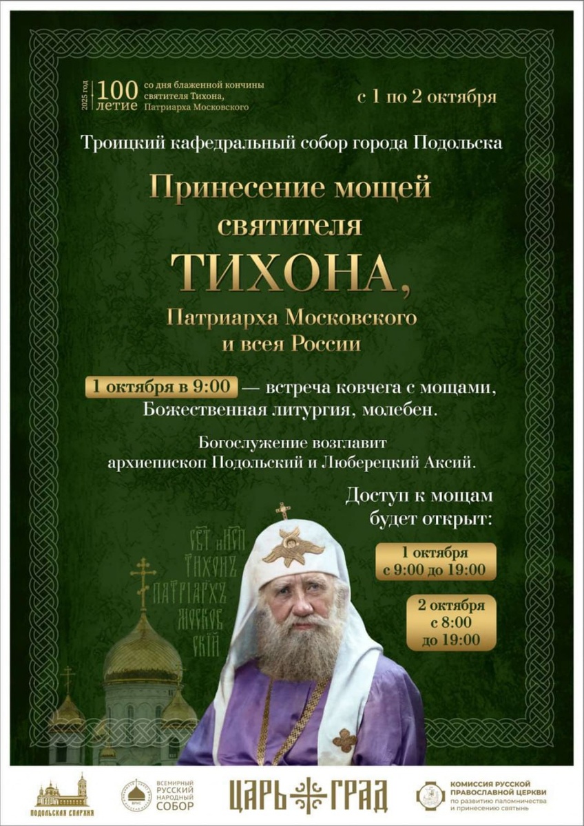 ✨ В Подольск прибудут мощи святителя Тихона одиннадцатого патриарха, избранного на Поместном Соборе Православной Российской Церкви 1917-1918 годов. ⏰С 9:00 до 19:00 1 октября и с 8:00 до 19:00 2 октября в соборе будет организовано поклонение святыне. 🙏Каждый час 1 октября с 12:00 до 16:00 и 2 октября с 11:00 до 16:00 у мощей святителя Тихона будет совершаться молебен. 🏢 Троицкиий кафедральный собор 📍г. Подольск, Соборная площадь, 3А 📆 01.10.2025 ⭐Поддержать канал голосом ✅ Мероприятия Чехов https://dzen.ru/id/66cc4b48e9ef144699238a51 http://vk.com/chekhov_events http://dzen.ru/chekhov_events