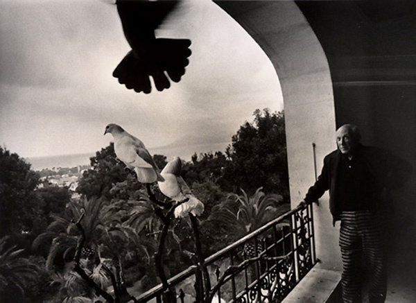 Это один из снимков с Пикассо, которые в 1957 году Дэвид Дуглас Дункан сделал на его вилле Калифорния. Здесь Пикассо — на балконе третьего этажа, с которого открывается вид на море, и где он устроил голубятню. Пикассо всю жизнь держал голубей, это пристрастие у него — с детства. Его отец тоже был заядлым голубятником, более того, он был художником-анималистом, и голуби были постоянными персонажами его картин. Маленькому Пабло разрешалось дорисовывать голубям лапки. Впоследствии Пикассо тоже не раз изображал этих птиц в своих работах, и самые известные из них — «голуби мира». Всё началось в раннем детстве – его отец был страстным любителем птиц, держал голубятню и, будучи художником, специализировался именно как анималист-голубятник. Маленький Пабло, отправляясь в классы, захватывал с собой отцовского голубя, чтобы быть уверенным, что уж теперь-то отец обязательно зайдет за ним. Когда мальчик научился держать в руках кисти, отец позволял ему дорисовывать птичьи лапки. Сравнительно недав