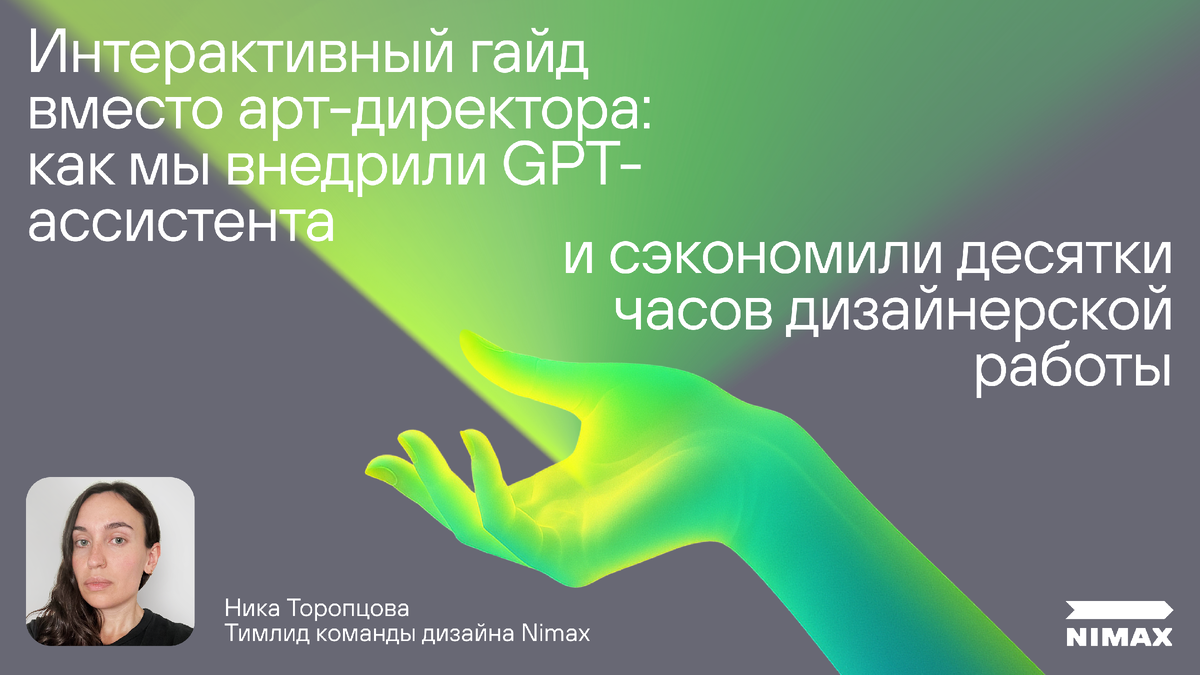 Что если арт-директору не придётся бесконечно перепроверять макеты и комментировать одни и те же ошибки? А гайдлайн будет не просто храниться в документе, а сам подсказывать, как применить правила бренда в конкретной задаче? Меня зовут Ника Торопцова, я тимлид группы дизайна в Nimax. Столкнувшись с рядом задач как тимлид, я собрала GPT-ассистента, который делает всё это. И даже больше: проверяет визуалы по ключевым параметрам, сопоставляет их с гайдлайном, предлагает улучшения и поддерживает дизайнеров ещё до ревью. Со временем стало понятно: такой ассистент может быть не просто помощником, а живым гайдом — системой, которая помогает дизайнерам не забывать, как «мы делаем», и быстрее принимать решения в духе бренда. Как я это реализовывала и какие выводы сделала — рассказываю в статье. Классические гайды-документы не всегда удобны в повседневной работе — со временем они могут устаревать, быть сложными в навигации и требовать доработки под новые задачи. GPT-ассистент помогает с этим бла