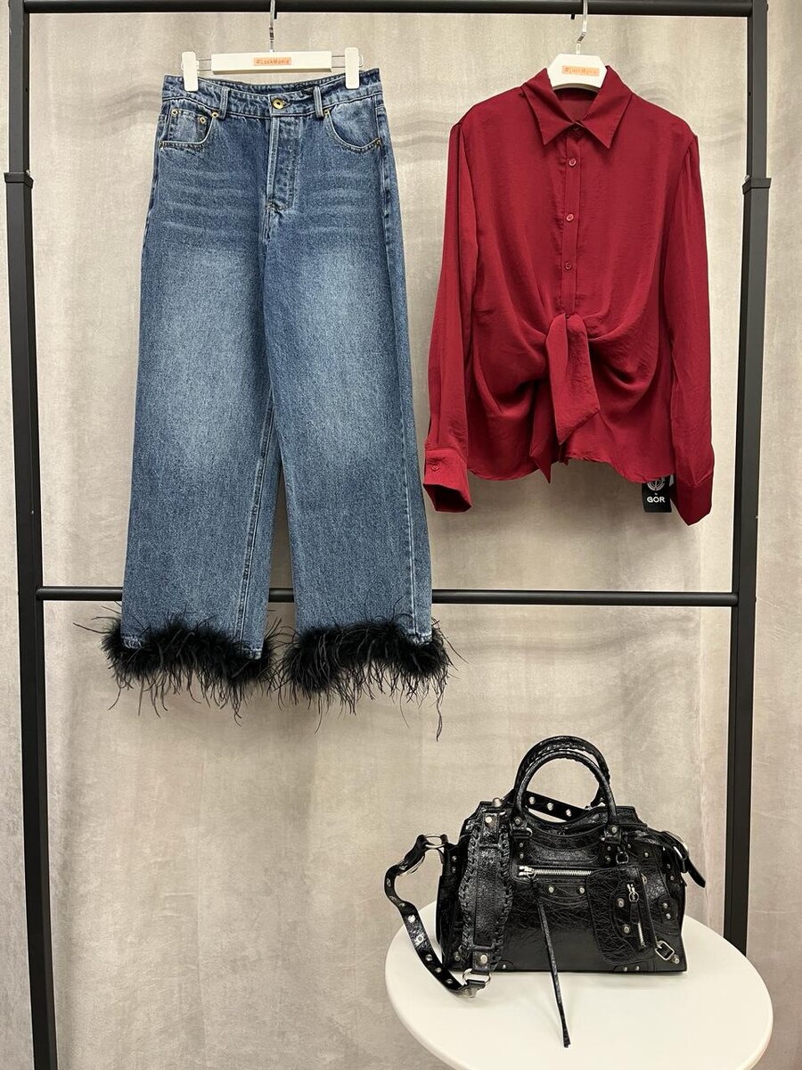 Образ для тех, кто не боится быть яркой: джинсы с перьями превращают casual в модный акцент, бордовая рубашка добавляет глубины и дерзости, а чёрная сумка завершает стильный сет. ✨Поможем с выбором размера — просто кликните по ссылке: тык