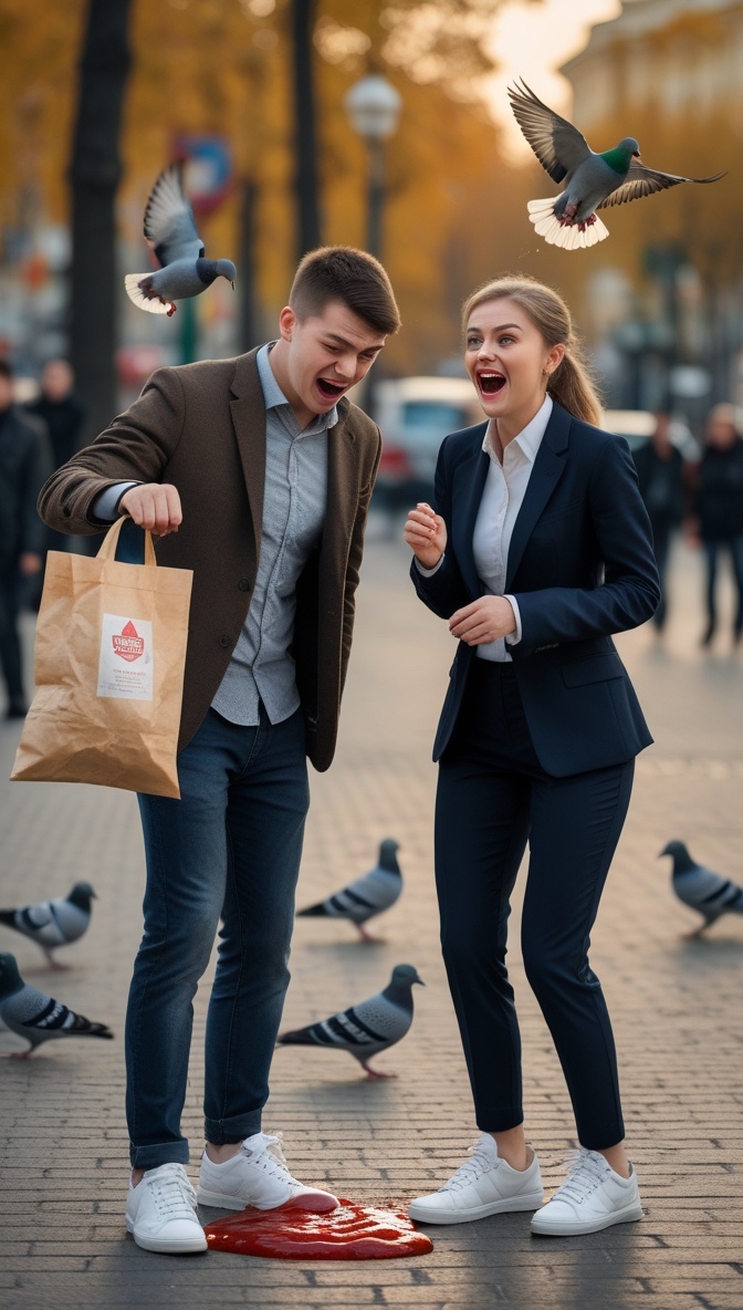 Девушка была... ну, скажем так, из тех, кто точно НЕ ожидал, что её утро вторника будет включать в себя томатно-чесночный соус на обуви.