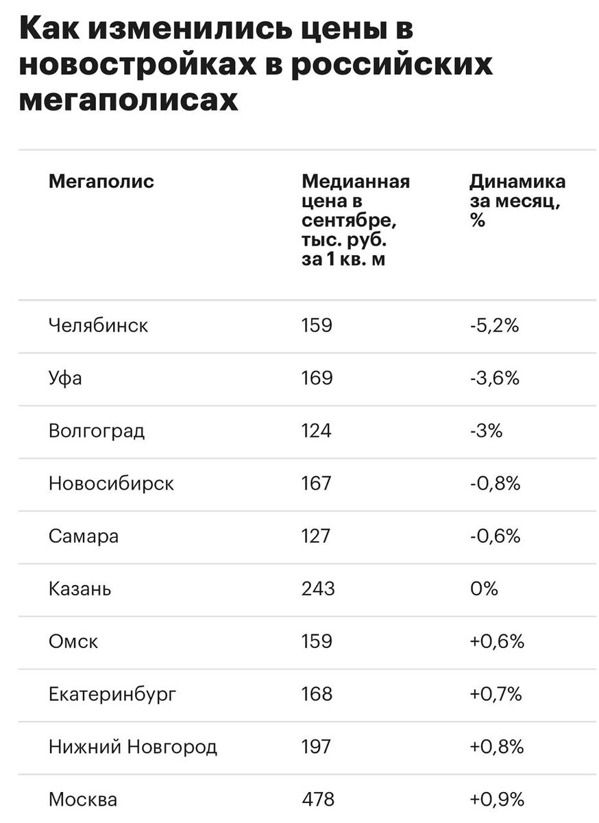Рост цен также зафиксирован в Краснодаре (+4,2%), Санкт-Петербурге (+3,8%), Перми и Красноярске (+2,6%). • Больше всего подешевели квартиры в Челябинске — -5,2% (159 тыс. руб. за м²).