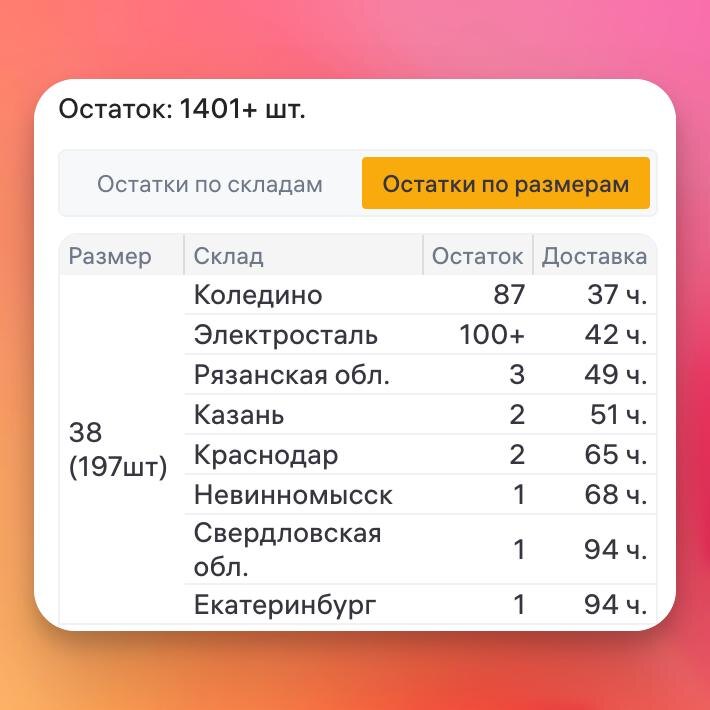 Про скрытие остатков на Wildberries Сейчас мне позвонил знакомый селлер, суть диалога: Мне звонил сервис ХХХХХ и говорят что они договорились с ВБ и у них все есть и заказы конкурентов они показывают точные. Это ложь! Менеджер просто пытается продать Вам в ущерб репутации сервиса, чтобы получить свои бонусы. Сразу еще развенчаю миф «ВБ скрыл остатки не по всем категориям». По всем! ВБ показывает остатки в разрезе склада и размера и если они превышают 100 шт, вб всегда будет показывать 100. И невозможно определить что же там происходит. Почему же в сервисах остатки больше 100? На скриншоте пример как отображают сервисы остатки по размерам и как получается остаток больше 100. Иногда даже кажется что он точный и соответствует действительности Если вы использовали сервисы аналитики для того чтобы мониторить рынок и сравнивать себя с конкурентами, то в большинстве случаев это больше не возможно из-за того что остатки сильно больше 100. Для этого остается только пользоваться сравнением