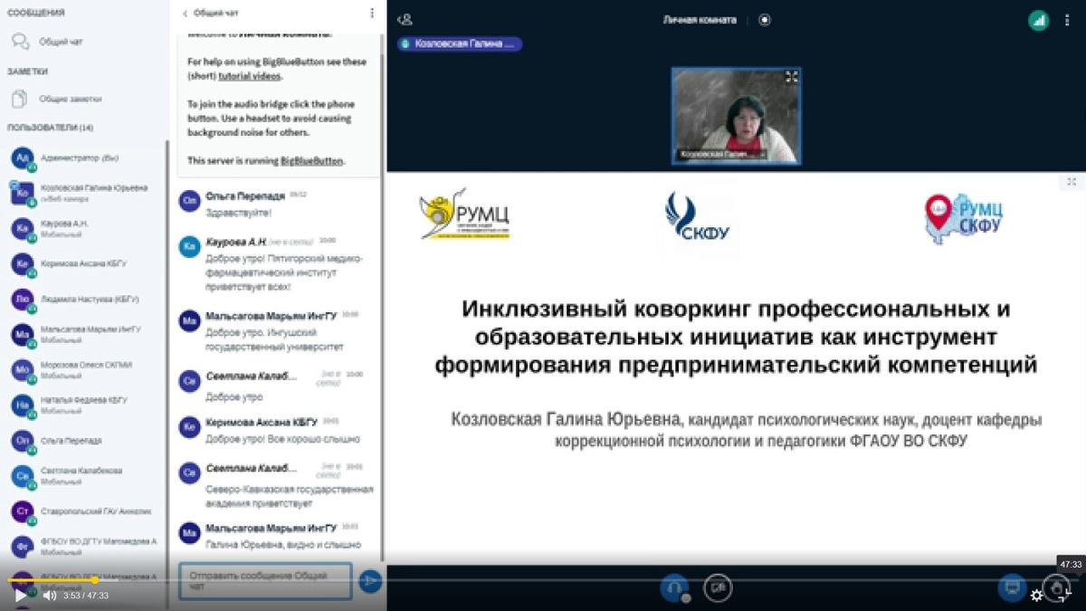 23 сентября 2025 года РУМЦ СКФУ провел вебинар-совещание вузов-партнеров Северо-Кавказского федерального округа «Формирование предпринимательских компетенций у молодежи с инвалидностью (на примере коворкинга профессиональных и образовательных инициатив СКФУ)» в онлайн-формате. Козловская Г.Ю., главный специалист по координации деятельности РУМЦ СКФУ, познакомила участников вебинара-совещания с деятельностью инклюзивного коворкинга профессиональных и образовательных инициатив как инструмента формирования предпринимательских компетенций. Сальникова О.Д., главный специалист по координации деятельности ЦКП СТСО РУМЦ, осветила такой вопрос, как техническое сопровождение формирования предпринимательских компетенций у молодежи с инвалидностью. Мухорьянова О.А., психолог РУМЦ СКФУ, рассказала о работе Акселератора предпринимательских компетенций РУМЦ СКФУ. Целью мероприятия стало обсуждение путей формирования предпринимательских компетенций у молодежи с инвалидностью посредством знакомства с в