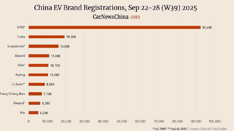 π Π ΠΠΈΡΠ°Π΅ ΡΠ΅Π³ΠΈΡΡΡΠ°ΡΠΈΠΈ ΡΠ»Π΅ΠΊΡΡΠΎΠΌΠΎΠ±ΠΈΠ»Π΅ΠΉ Π·Π° 39-Ρ Π½Π΅Π΄Π΅Π»Ρ: Xpeng β 10 400, Nio Group β 10 800, Tesla β 19 300, BYD β 92 400