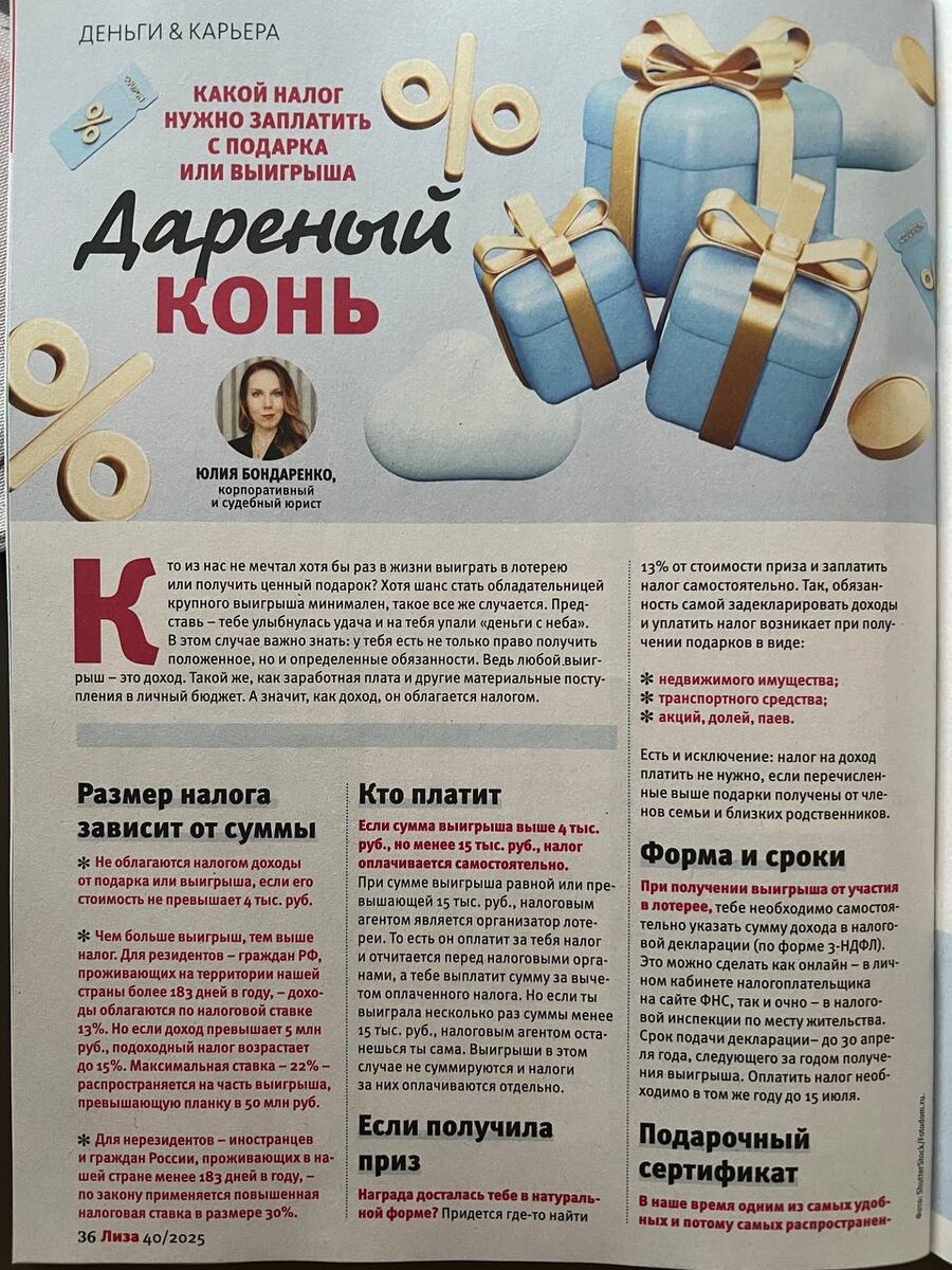 В журнале "Лиза" разместили мой материал про налог с выигрыша и возврат денег за подарочный сертификат.